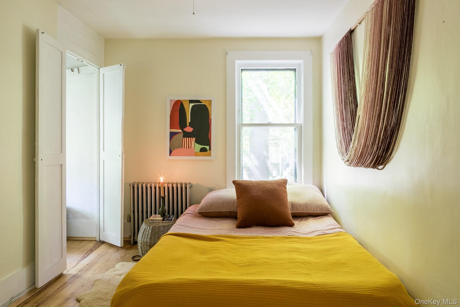 - Bedroom featuring radiator heating unit and light wood-style floors
