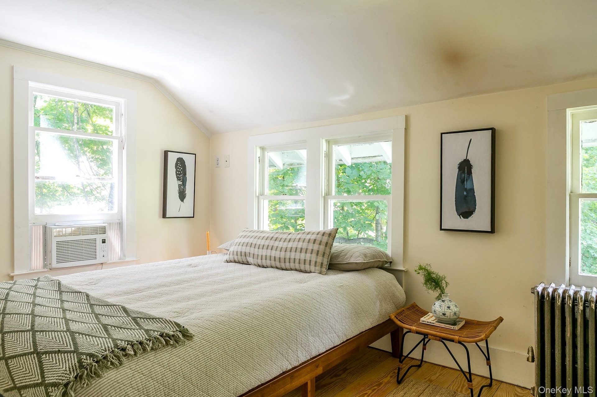 - Bedroom with radiator, wood finished floors, and vaulted ceiling