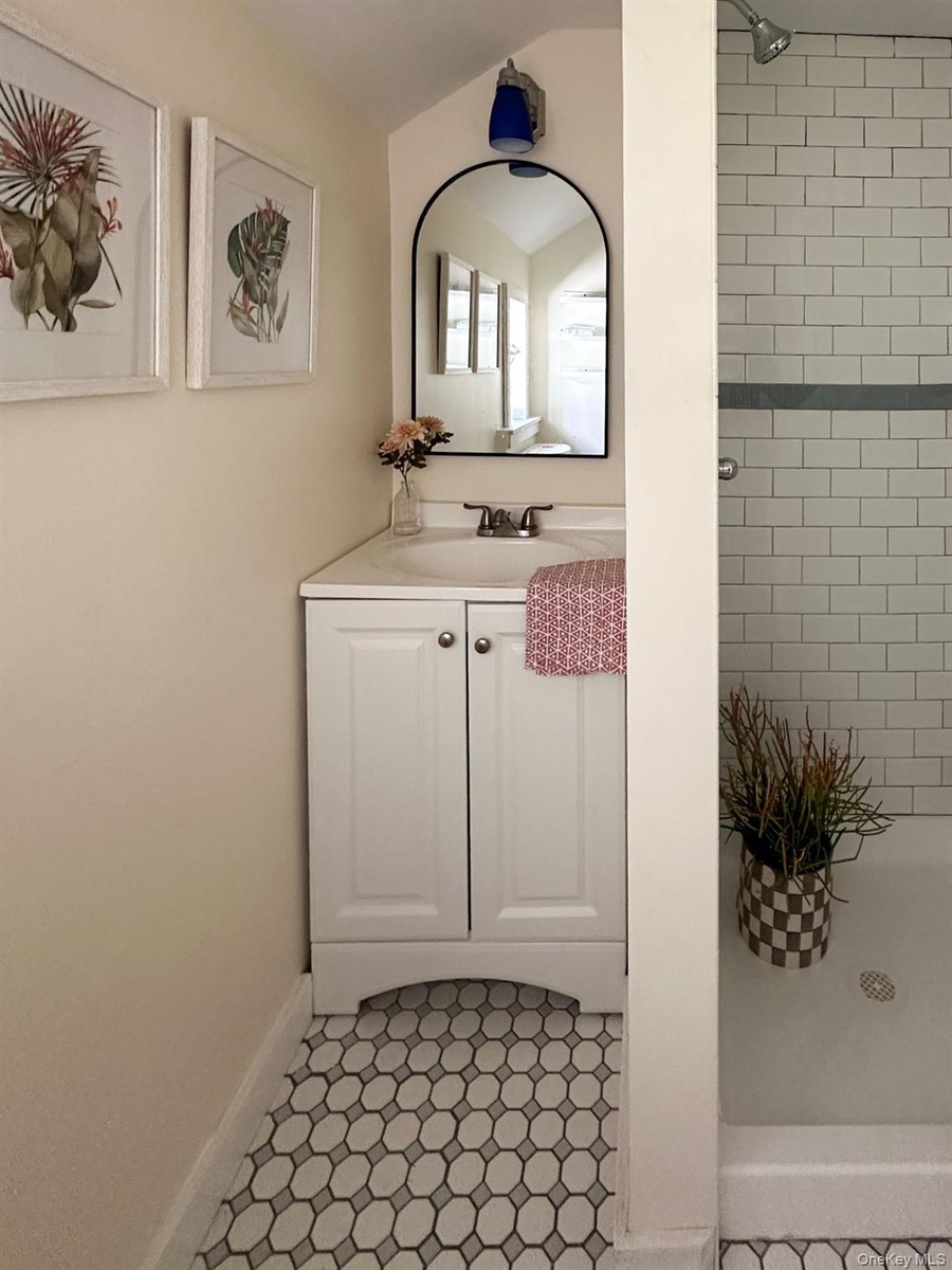 - Full bathroom with a shower stall, vanity, and light tile patterned floors