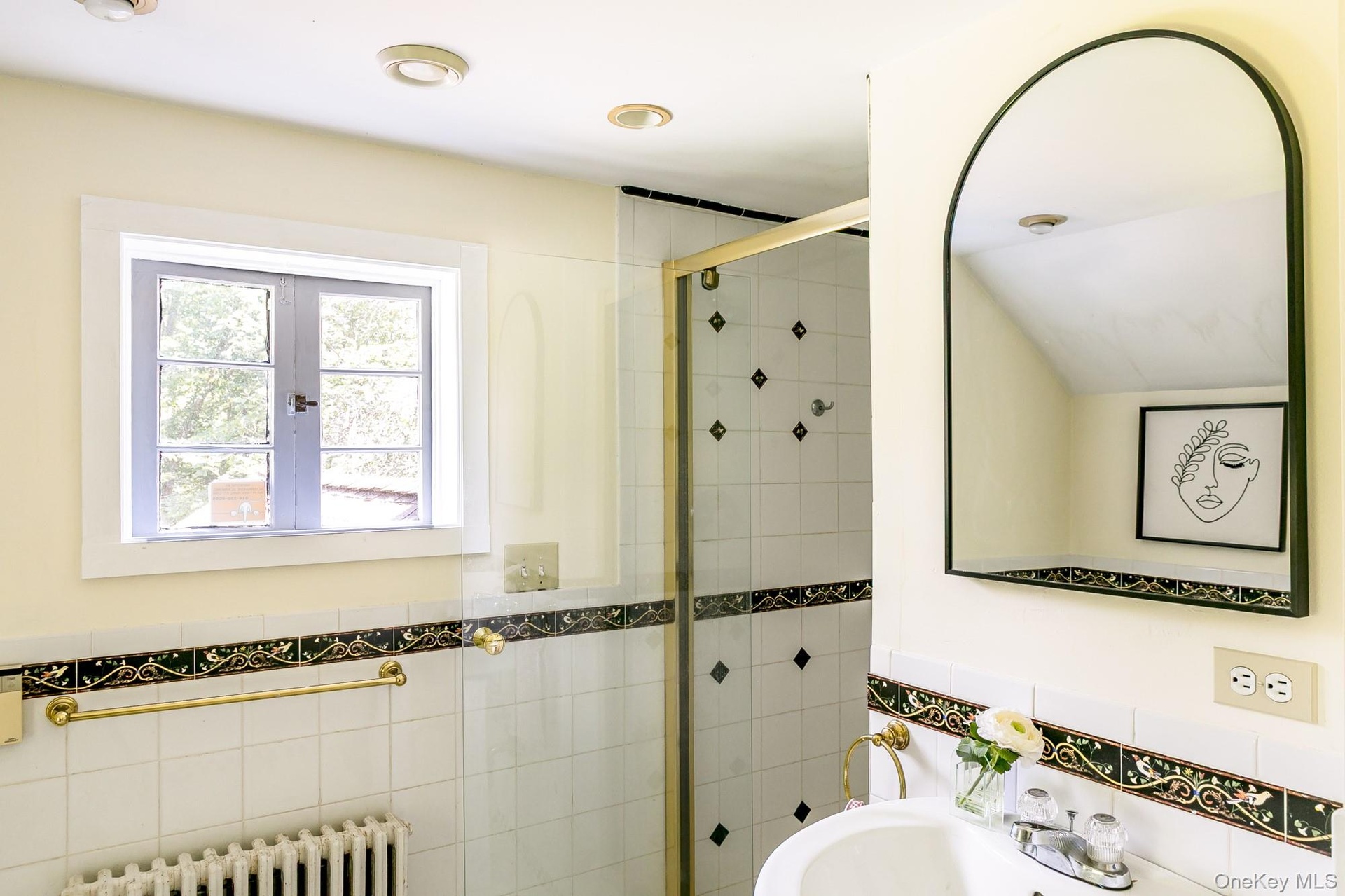 - Full bath featuring tile walls, a stall shower, radiator, and wainscoting