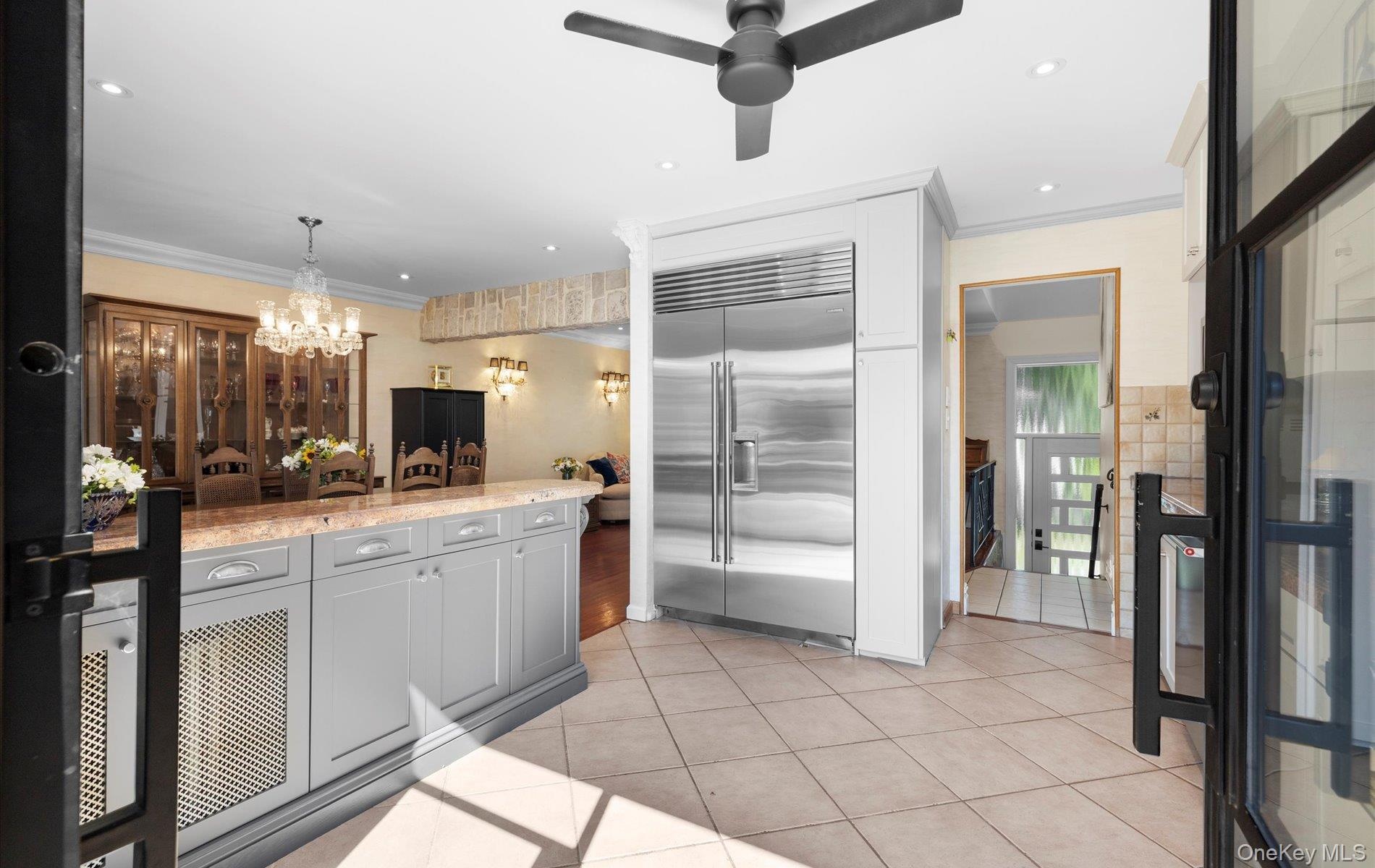 - Kitchen featuring stainless steel built in fridge, light tile patterned floors, gray cabinetry, light stone countertops, and decorative light fixtures