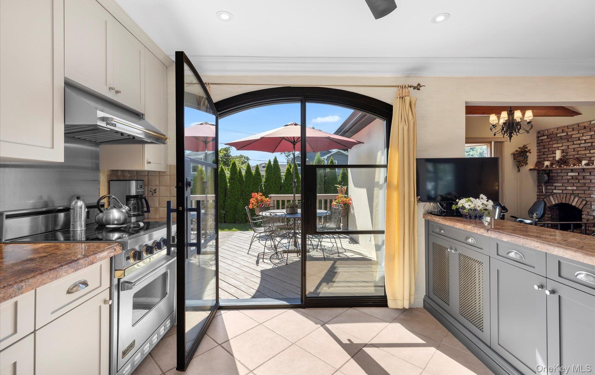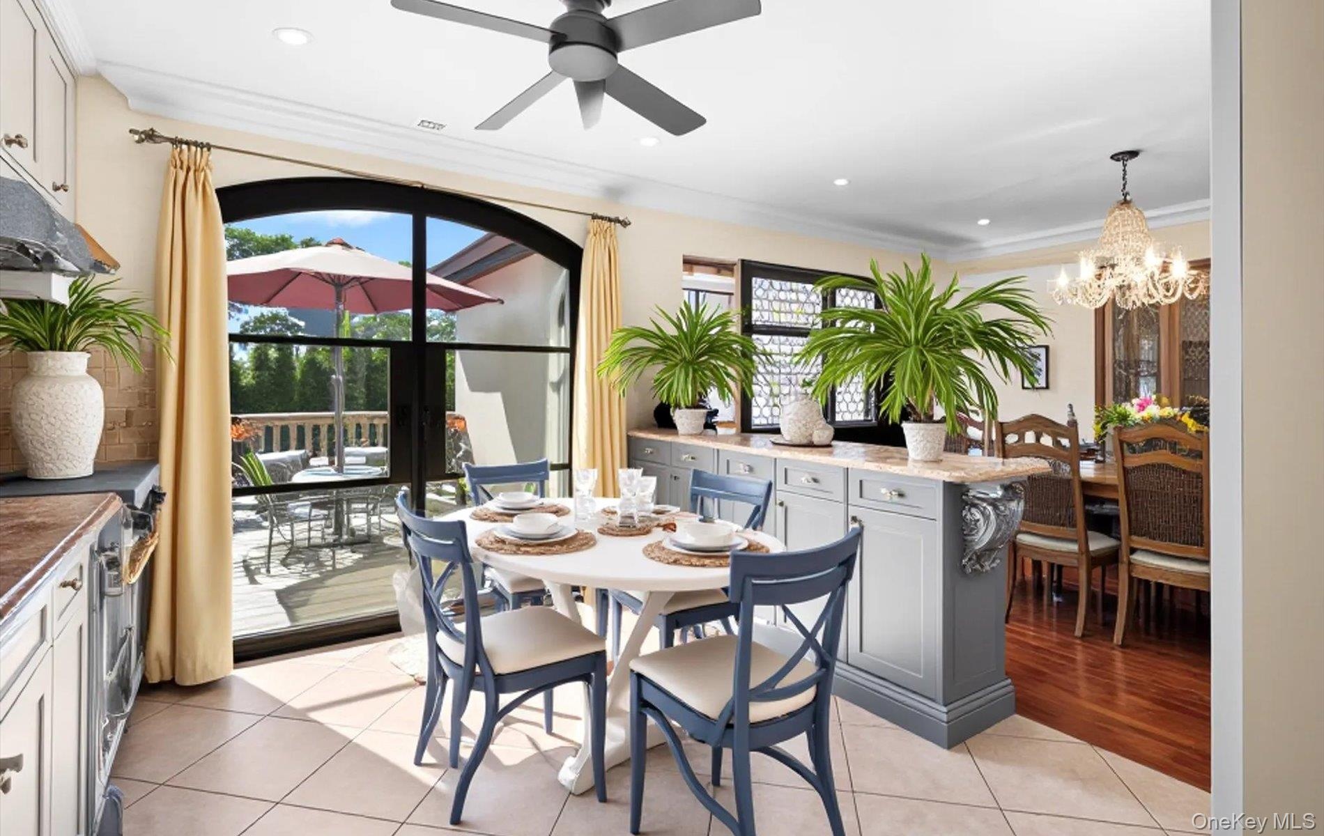 - EIK Dining space with high end stainless appliances, granite, natural light, light tile floors, recessed lighting, crown molding, ceiling fan