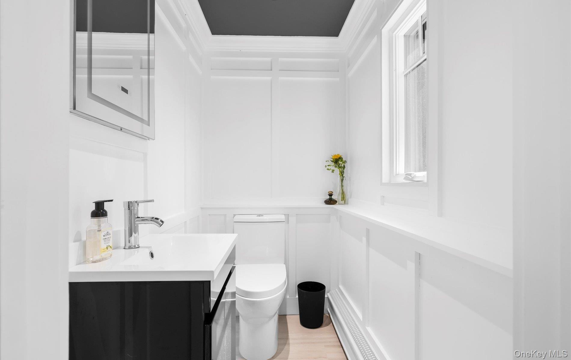 - Bathroom featuring a decorative wall, vanity, and light wood-style floors