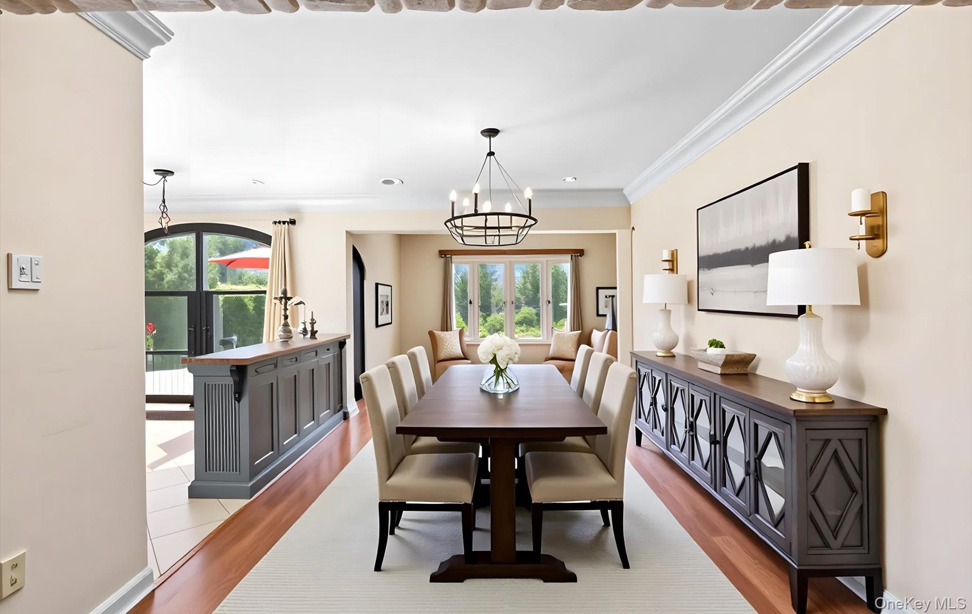 - Staged Dining room with crown molding, a chandelier, light wood-style flooring, and recessed lighting