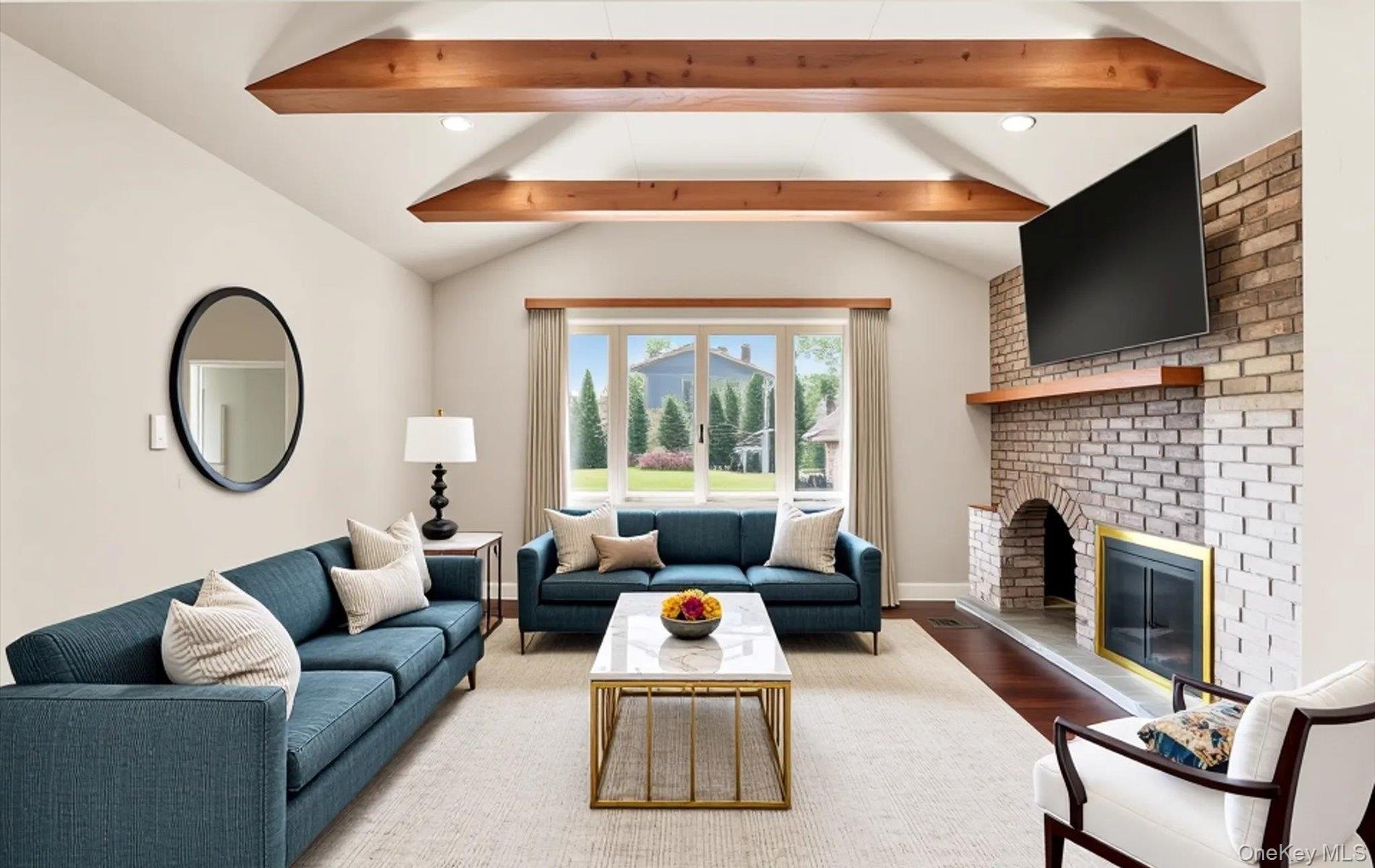 - Staged Den area with wood finished floors, a brick fireplace, and recessed lighting, vaulted ceiling with wrapped wood beams, bay window.