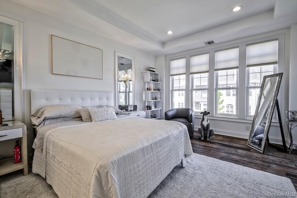 - Bedroom featuring a tray ceiling, dark wood finished floors, and recessed lighting