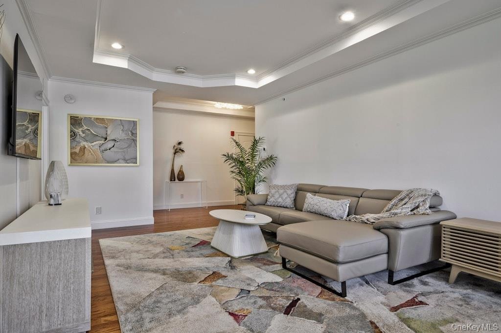 - Living area featuring recessed lighting, wood finished floors, a raised ceiling, and ornamental molding