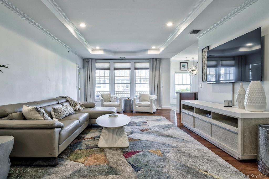 - Living area featuring a raised ceiling, dark wood-style floors, crown molding, and recessed lighting