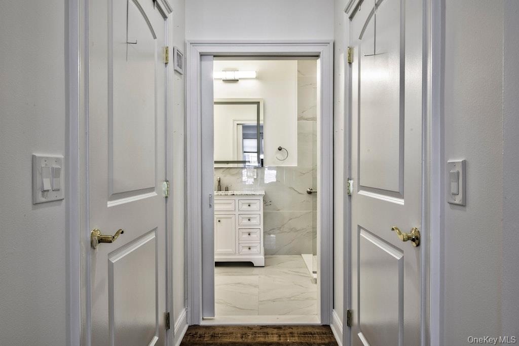- Hallway featuring dark marble finish flooring
