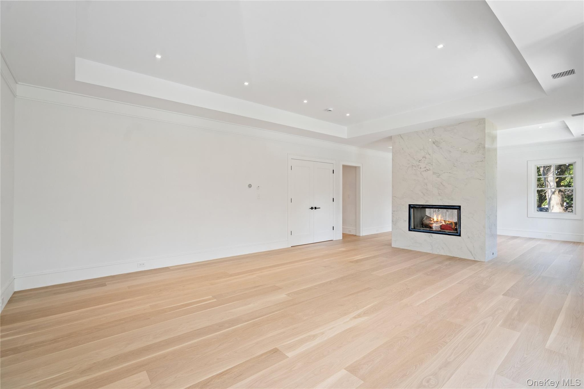 - Unfurnished living room featuring a raised ceiling, light wood finished floors, a fireplace, and recessed lighting