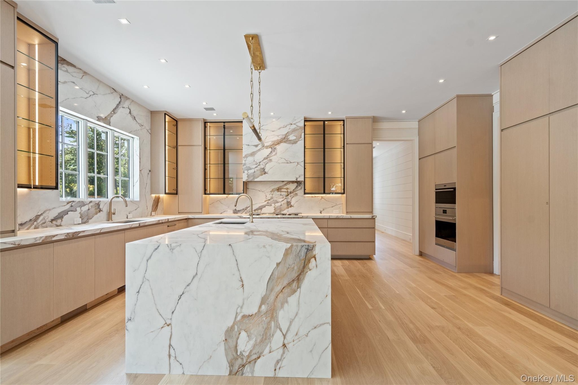 - Kitchen with decorative backsplash, light brown cabinets, modern cabinets, light stone countertops, and recessed lighting