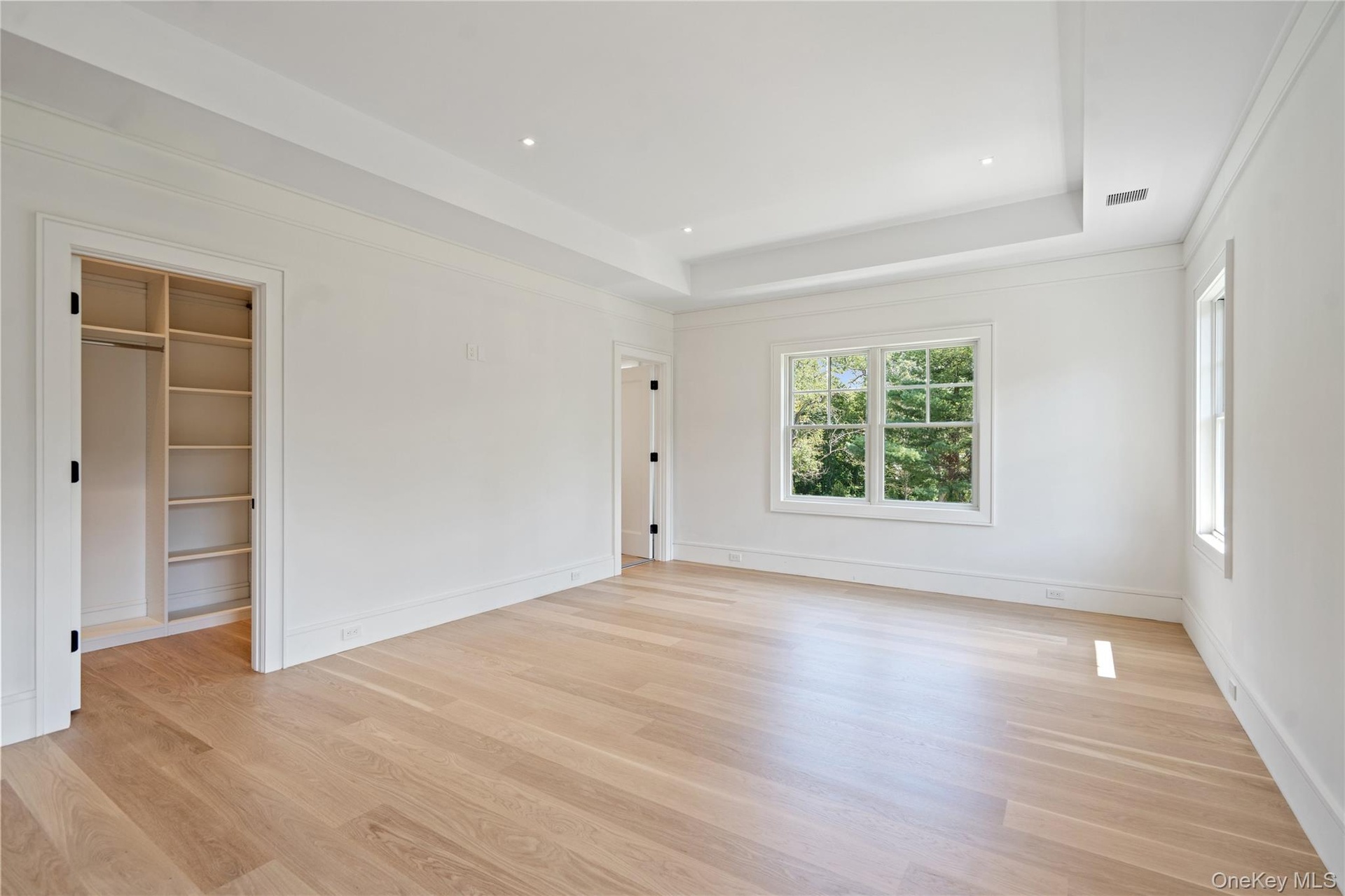- Unfurnished bedroom with light wood-style floors, a spacious closet, a tray ceiling, and recessed lighting