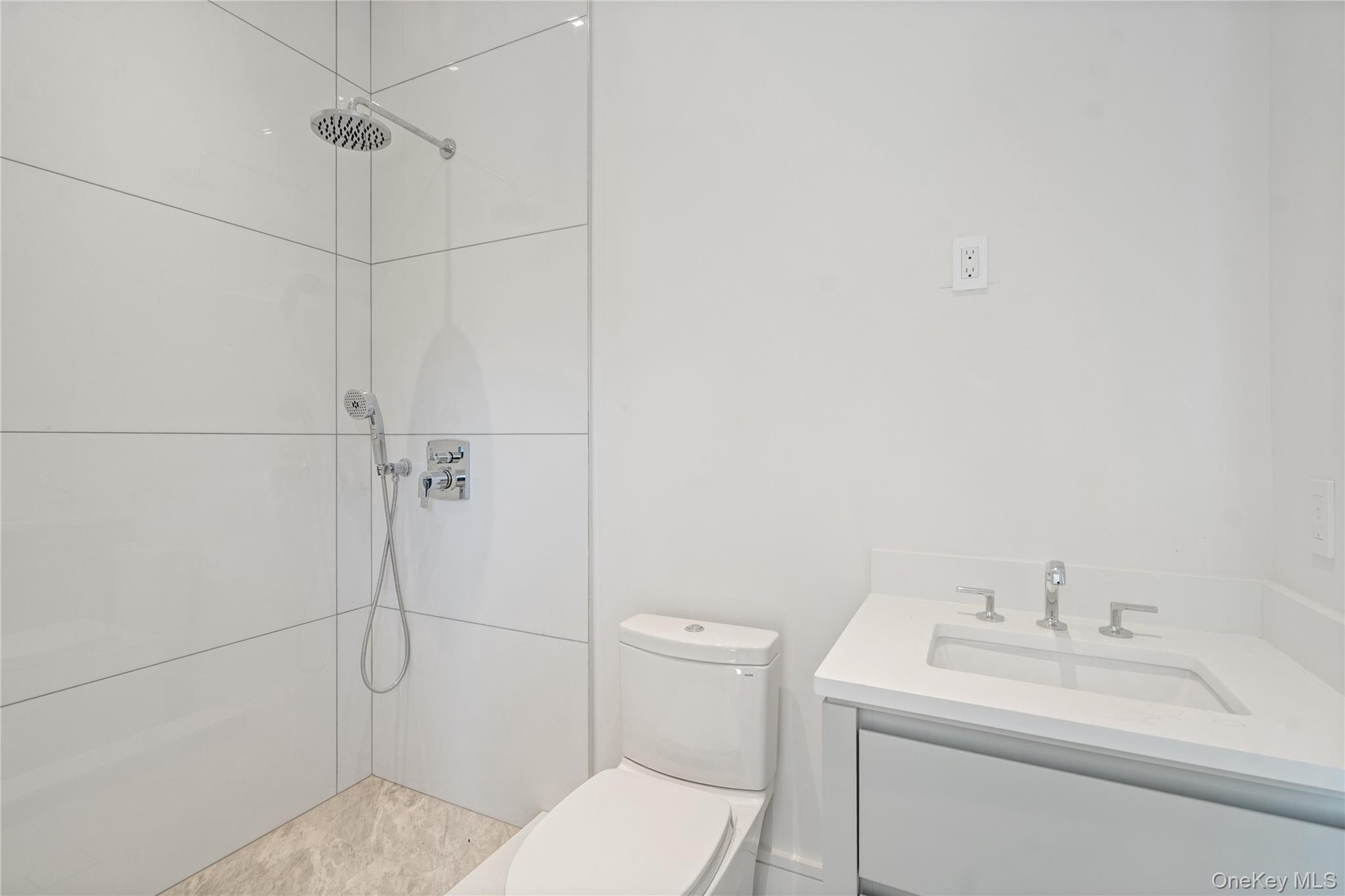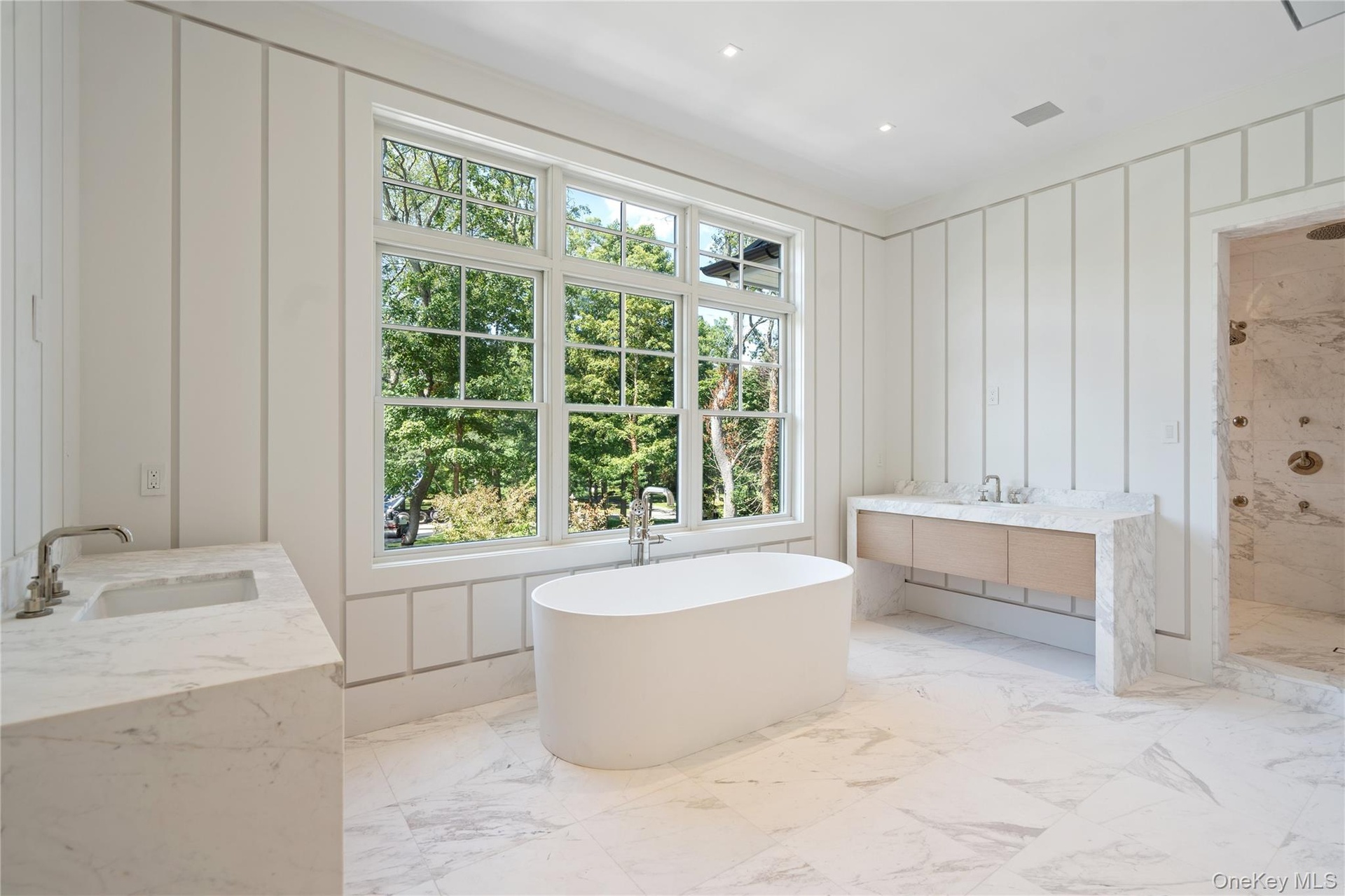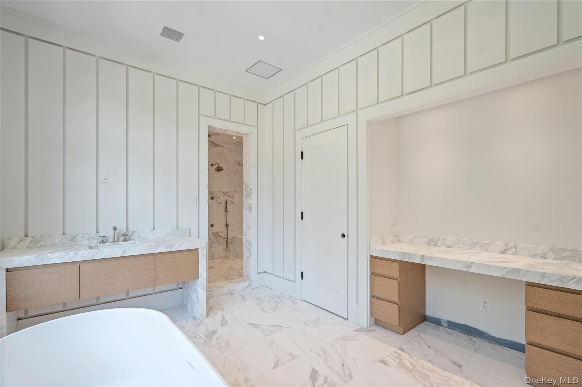- Bathroom featuring a marble finish shower, light marble finish floors, vanity, a soaking tub, and a decorative wall