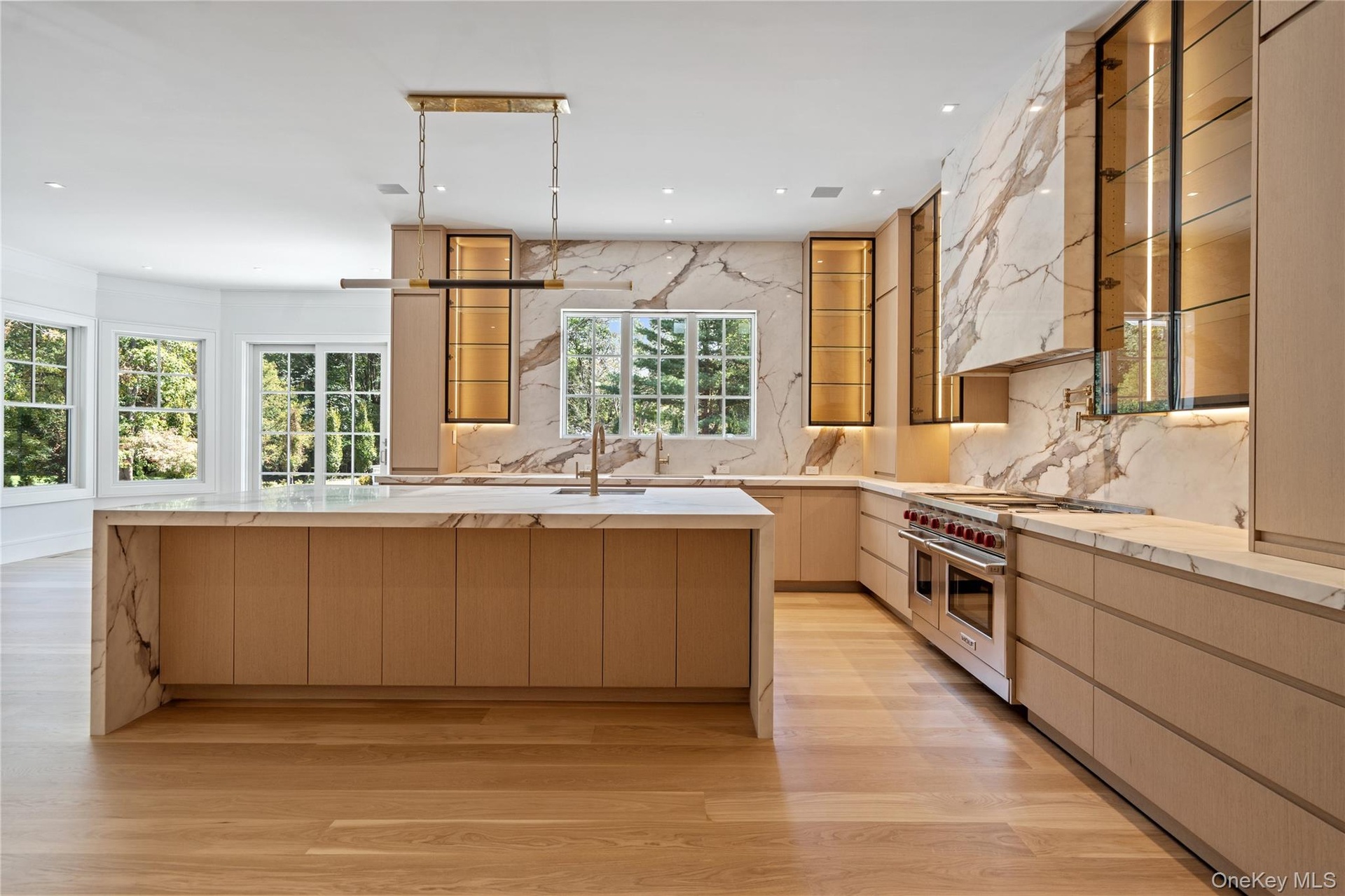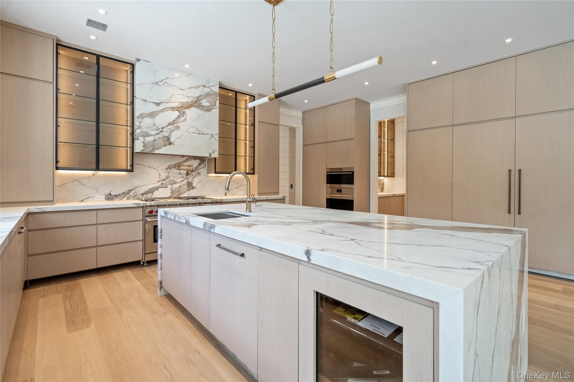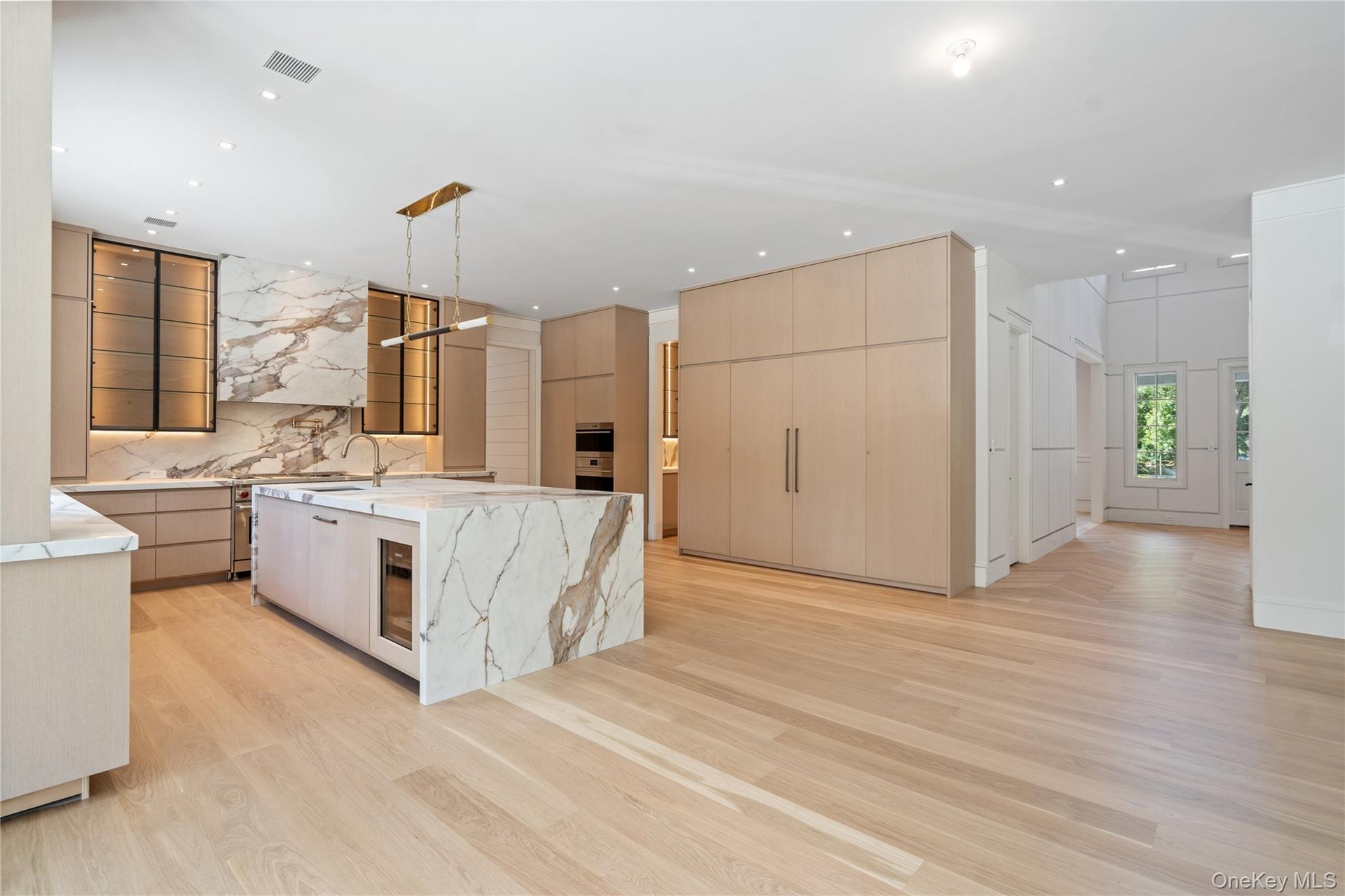 - Kitchen featuring decorative light fixtures, light wood-style floors, modern cabinets, light stone countertops, and decorative backsplash