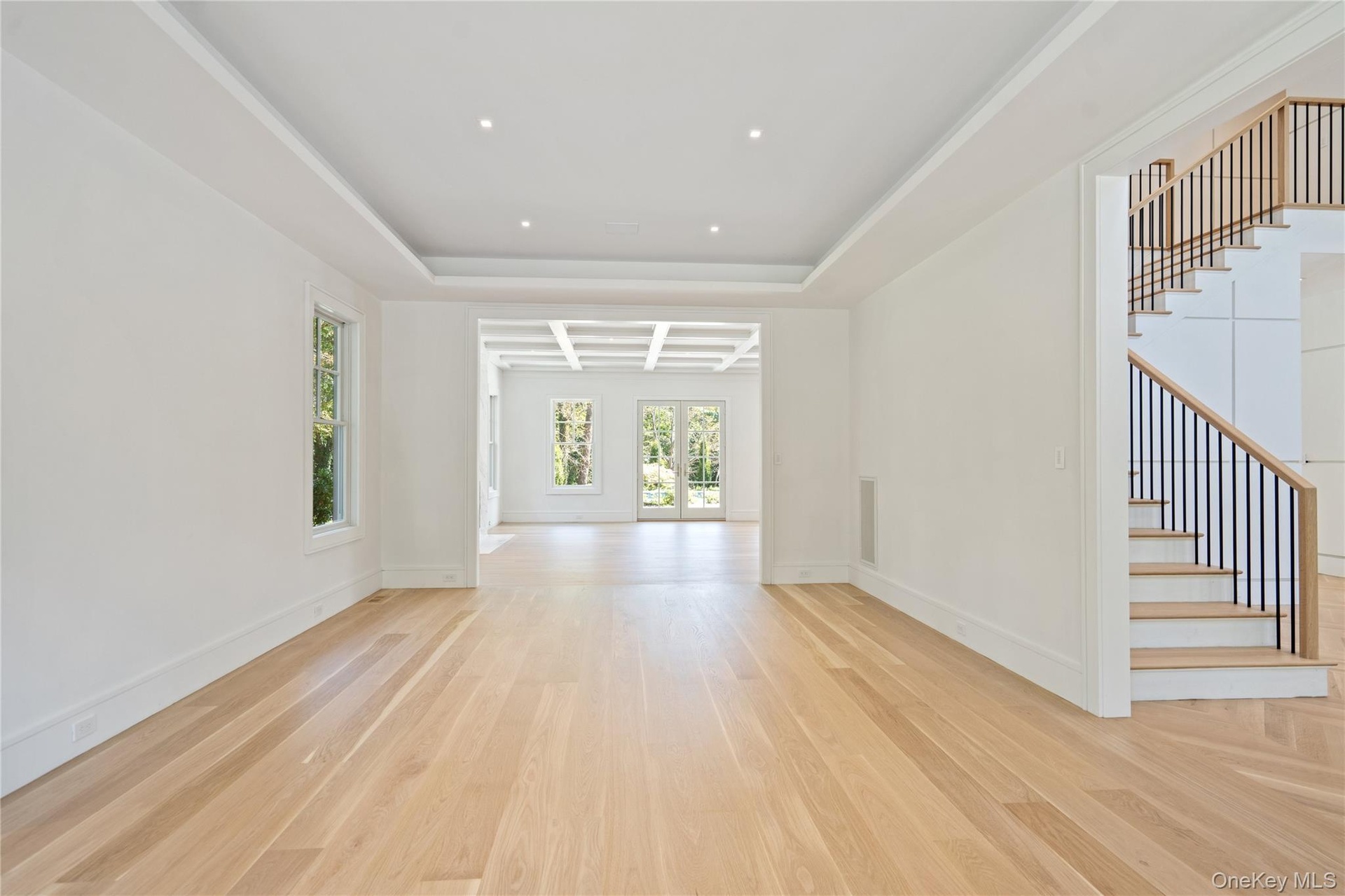 - Unfurnished living room with a raised ceiling, light wood-type flooring, stairs, french doors, and recessed lighting
