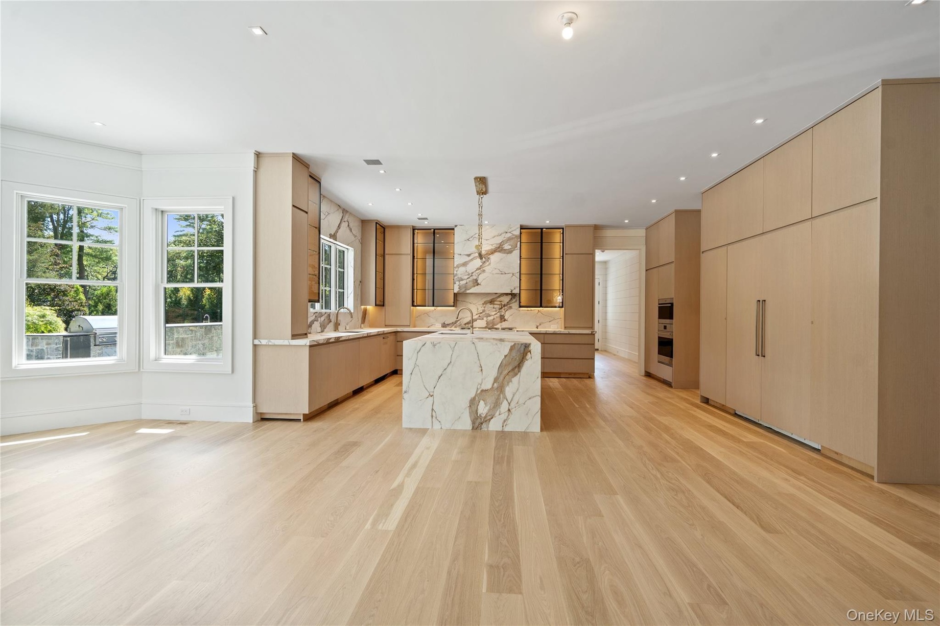 - Kitchen with decorative light fixtures, light stone countertops, light brown cabinetry, light wood-type flooring, and an island with sink