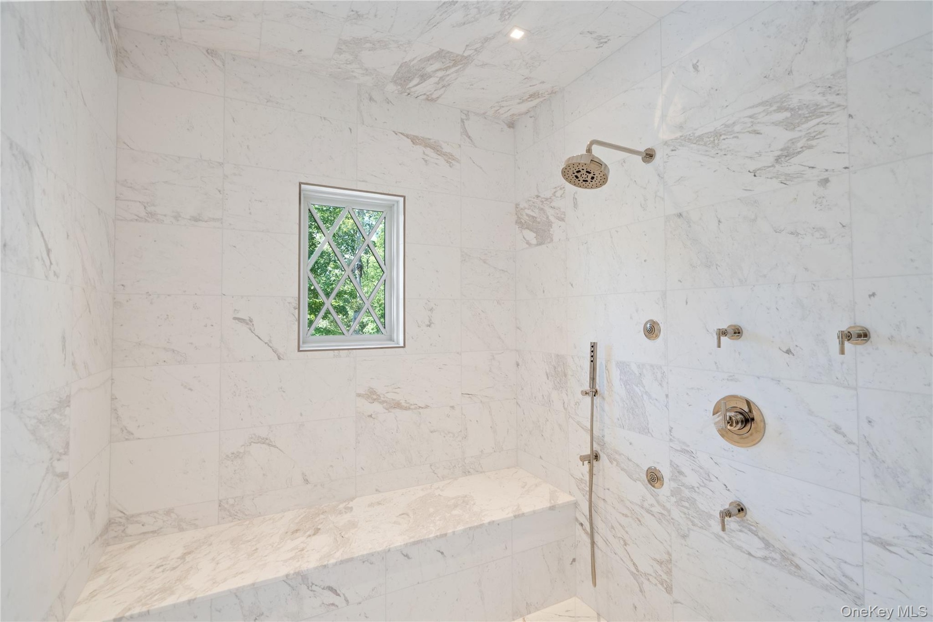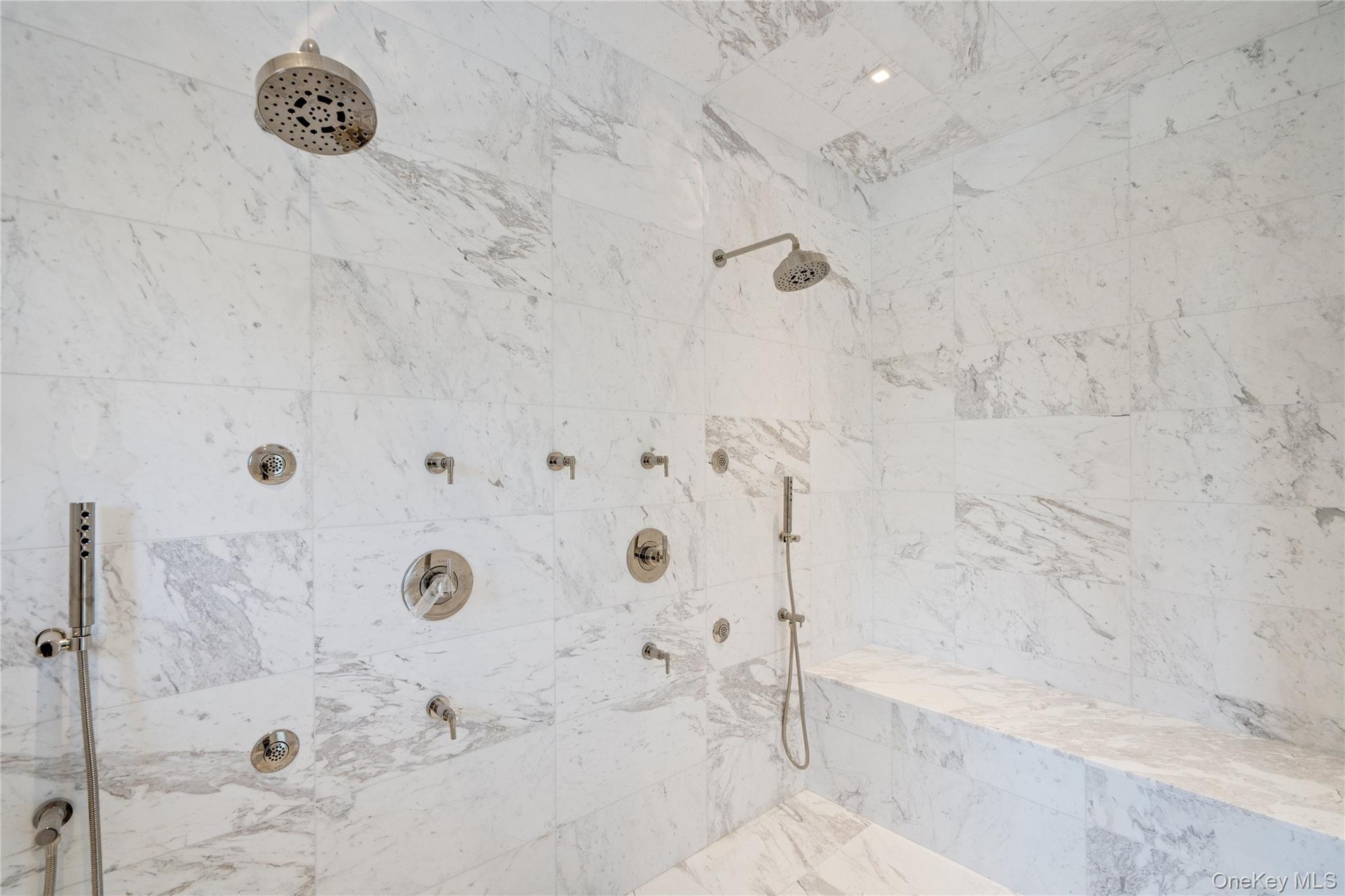 Making way upstairs and hidden behind double doors is a grand primary suite - offering an open bedroom and sitting area, separated by a double-sided marble fireplace. Just past the huge walk-in closet with build-in storage and island is a spa-like bathroom, with floor to ceiling marble tiling. Featuring a soaking tub with views of the front courtyard, double vanities and makeup station, the main highlight of possibly the entire home is a stunning, oversized walk-in shower. A rainfall showerhead is centered around steamers, body jets, and handhelds, with two benches, creating a tranquil escape to wash the day away. The second floor contains the remaining four bedrooms all feature en-suite full bathrooms and walk-in closets, full laundry room, and opportune bonus room with the potential to be transformed into a home office or play room.