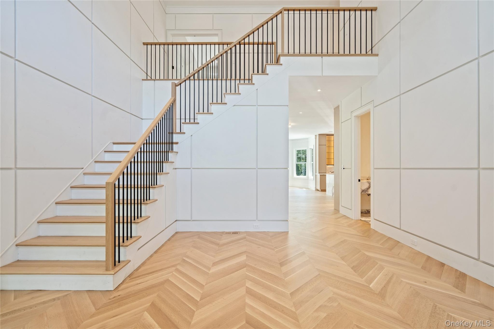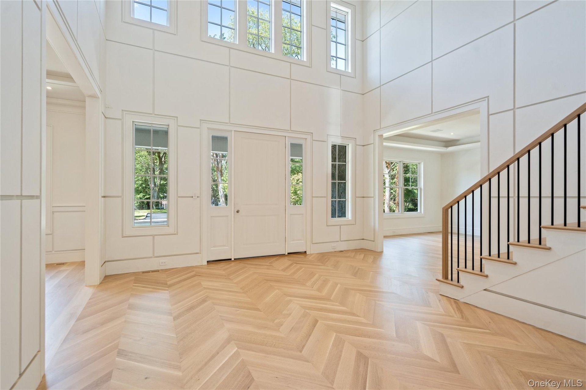 - Foyer featuring a high ceiling, stairway, and a decorative wall