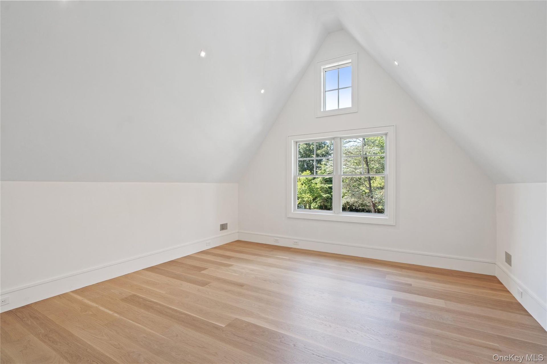 - Additional living space with vaulted ceiling, light wood-style flooring, and recessed lighting