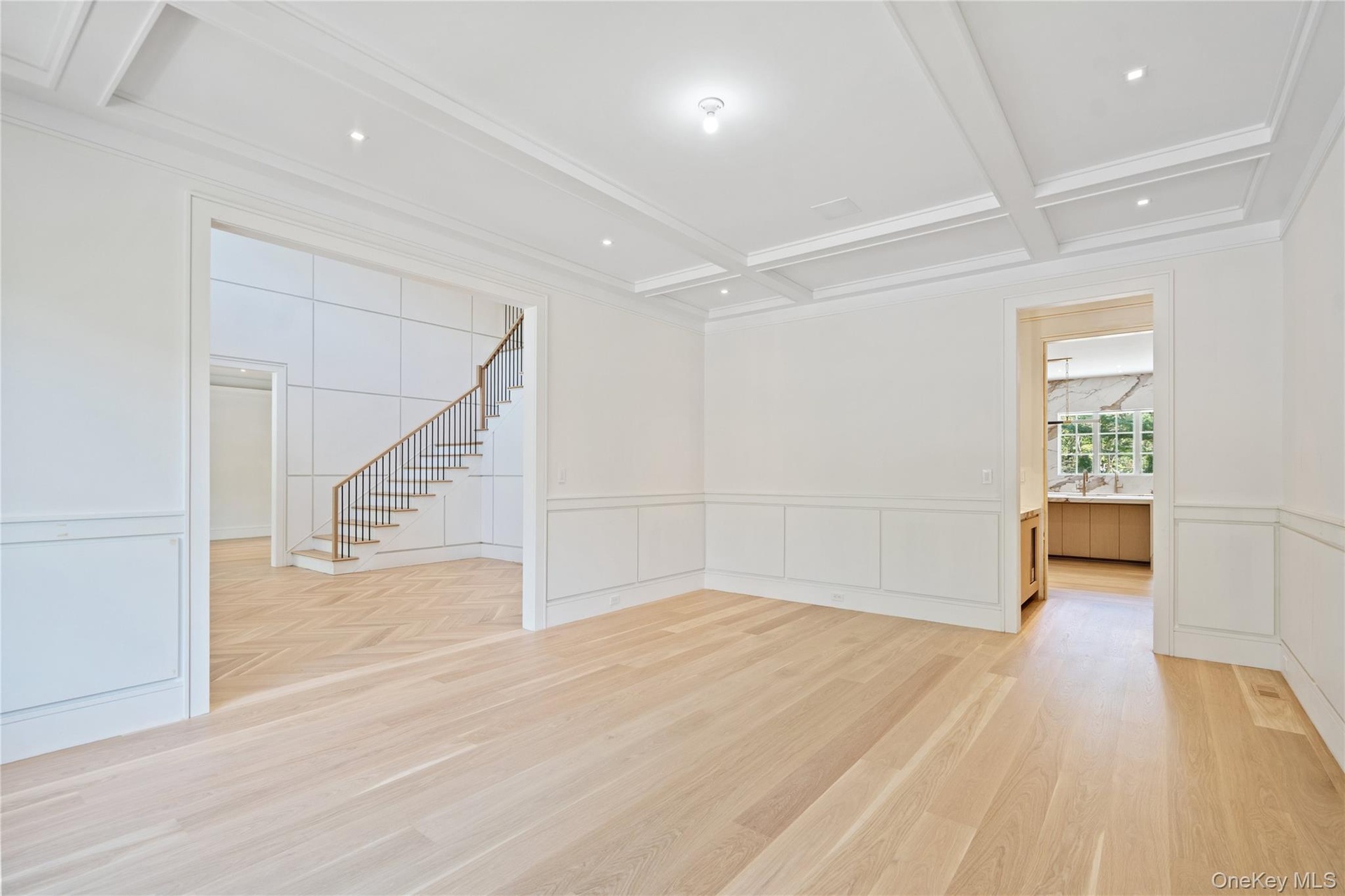 - Empty room with light wood-style flooring, beamed ceiling, a decorative wall, coffered ceiling, and wainscoting