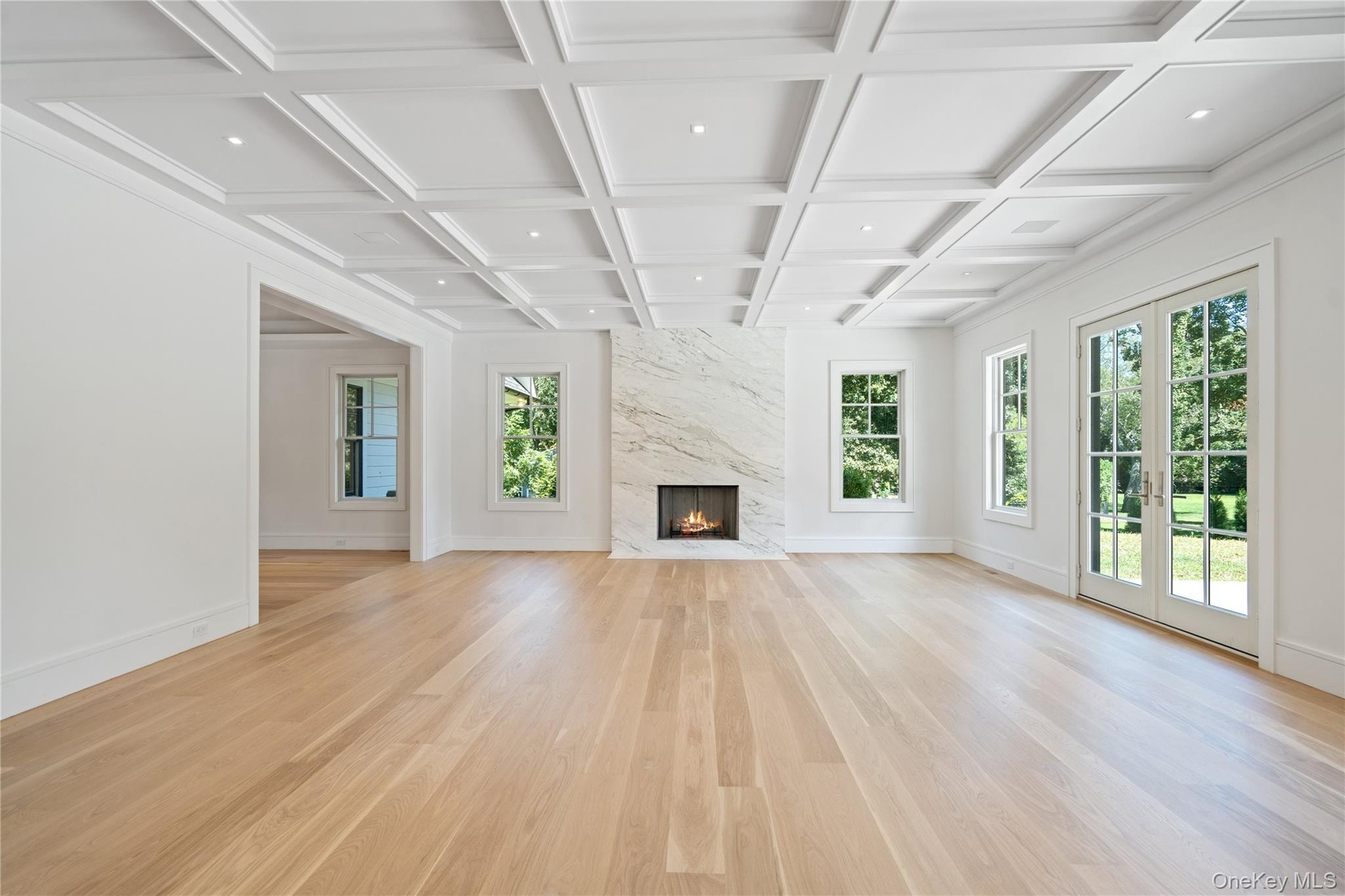 - Unfurnished living room featuring light wood-style floors, beamed ceiling, a high end fireplace, french doors, and coffered ceiling