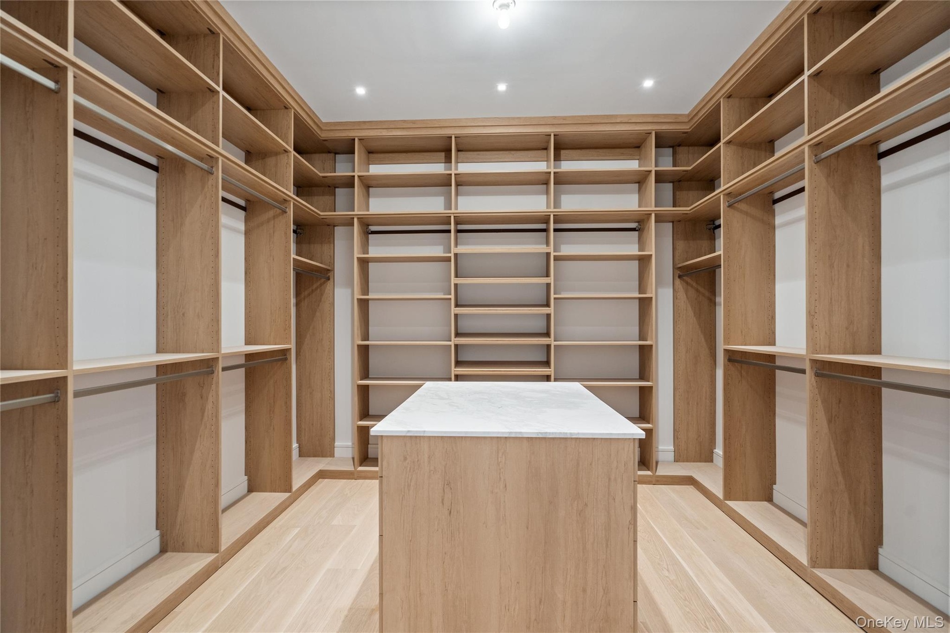 Entering through the front door welcomes you into the lofty foyer, revealing an elegant staircase leading to the second floor, large coat closet and marble powder room, catering to guests. Hidden behind a translucent glass door off the formal living room is a truly breathtaking space - a den with airy, cathedral ceilings, creamy oak paneling, and centered around a marble-encased fireplace. Paired with a powder room, this den can be transformed into a cozy retreat or private office space. Adding to the open-concept flow of the first floor, the formal living room leads to a spacious family room with a second marble fireplace, breakfast nook and the heart of the home - a custom chef’s kitchen. Complete with a waterfall marble island, white oak cabinetry, paneled dual dishwashers and Sub-Zero refrigerator & freezer, envision everyday meals, holiday gatherings, and hosted parties in this aesthetic and inviting atmosphere. Off the kitchen is a galley-style butler’s pantry providing extra storage and a wet bar, leading to the formal dining room.