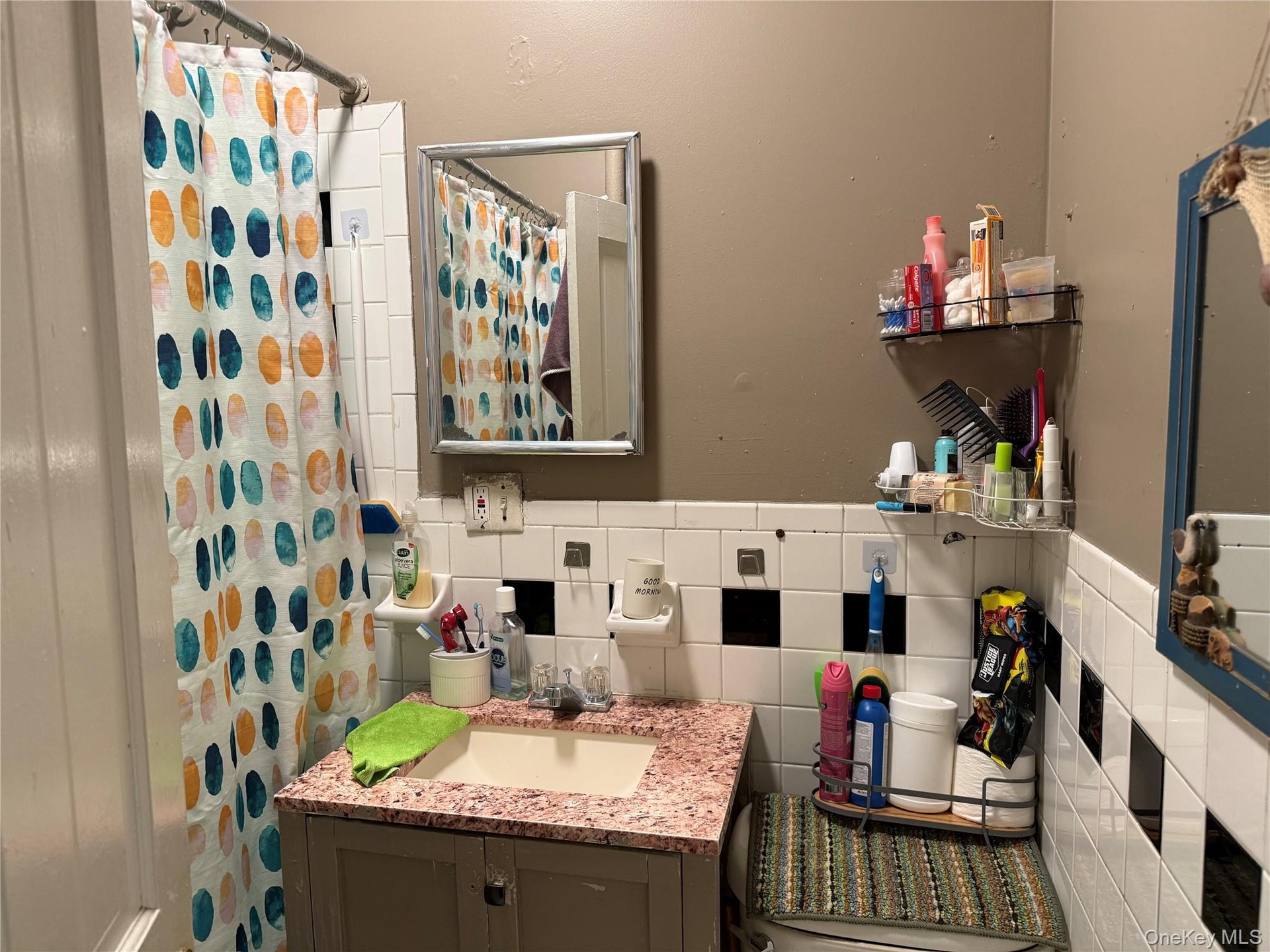 - Bathroom featuring tile walls, vanity, and a shower with shower curtain