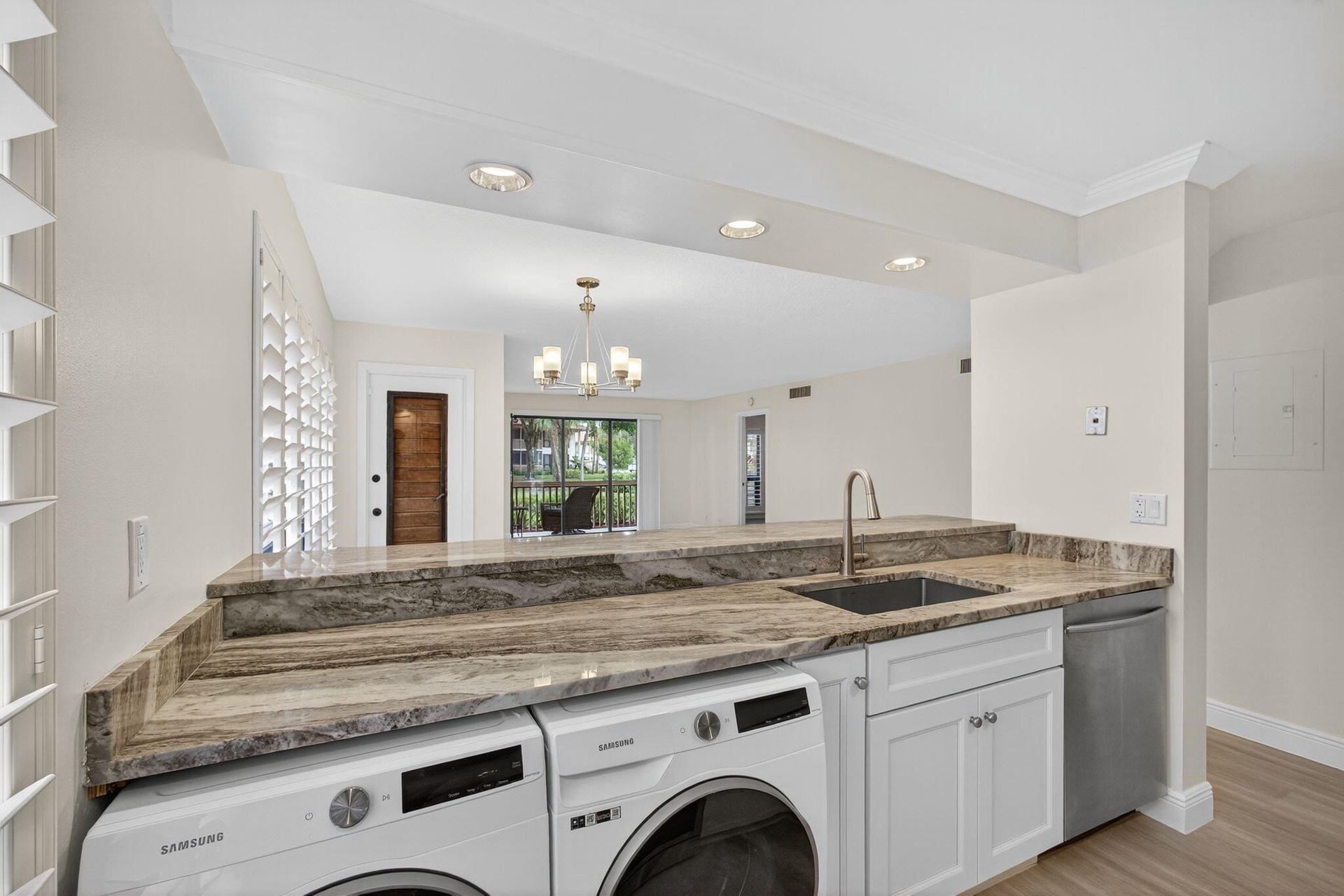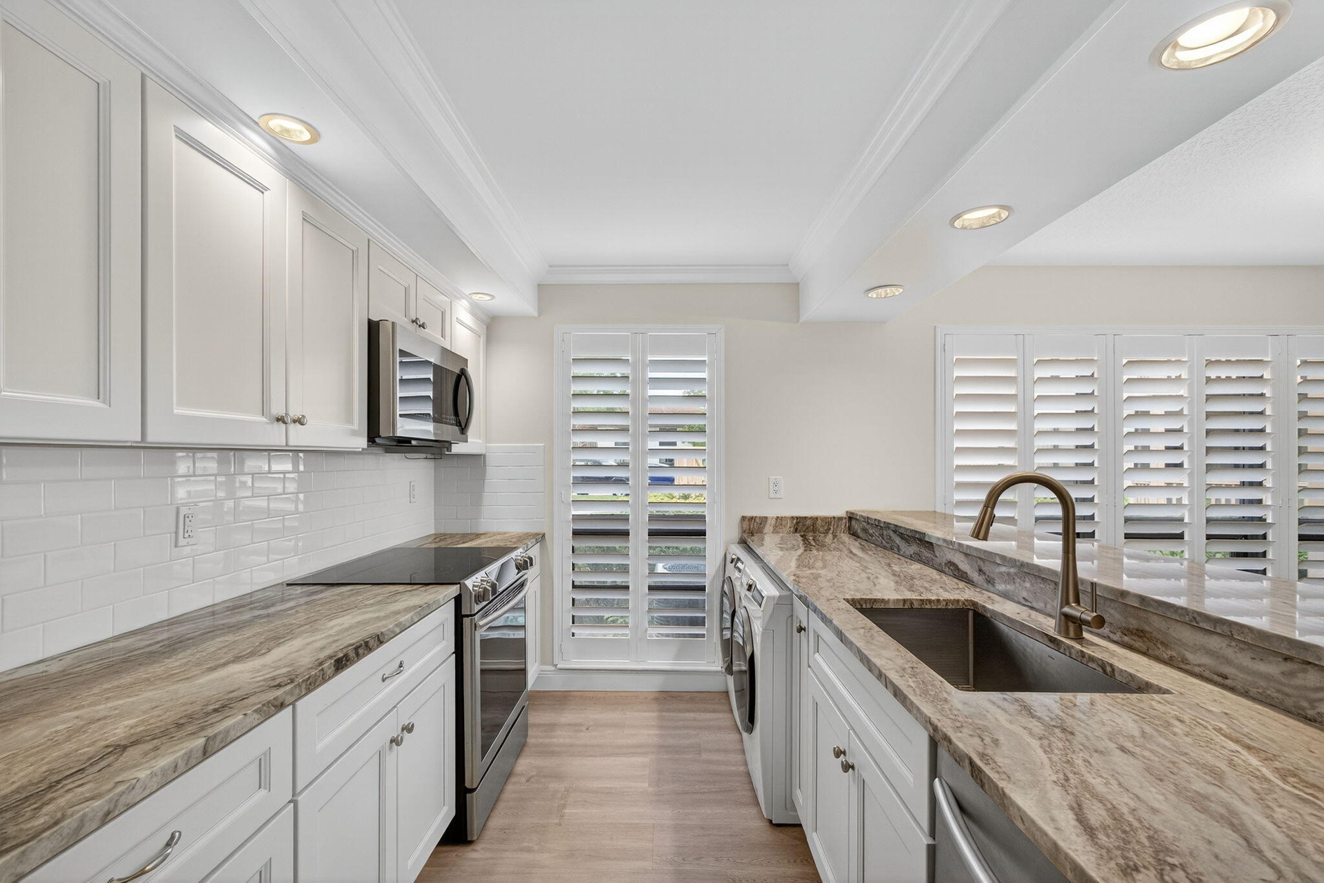 Enjoy effortless living in this beautifully remodeled 2-bedroom, 2-bathroom condo located in the sought-after Golf Villas community of PGA National. This spacious 1,366 sq. ft. first-floor, corner unit offers a bright, open layout and stylish upgrades throughout--perfectly move-in ready.Upon walking in you are greeted with an updated kitchen with modern finishes and stainless steel appliances, plantation shutters, and all-new flooring throughout. The primary suite includes a beautifully renovated en-suite bath. In-unit washer and dryer are less than a year old for your comfort and convenience. Enjoy two community pools and the exceptional lifestyle PGA National offers. Perfect as a full-time home, seasonal retreat, or investment opportunity!