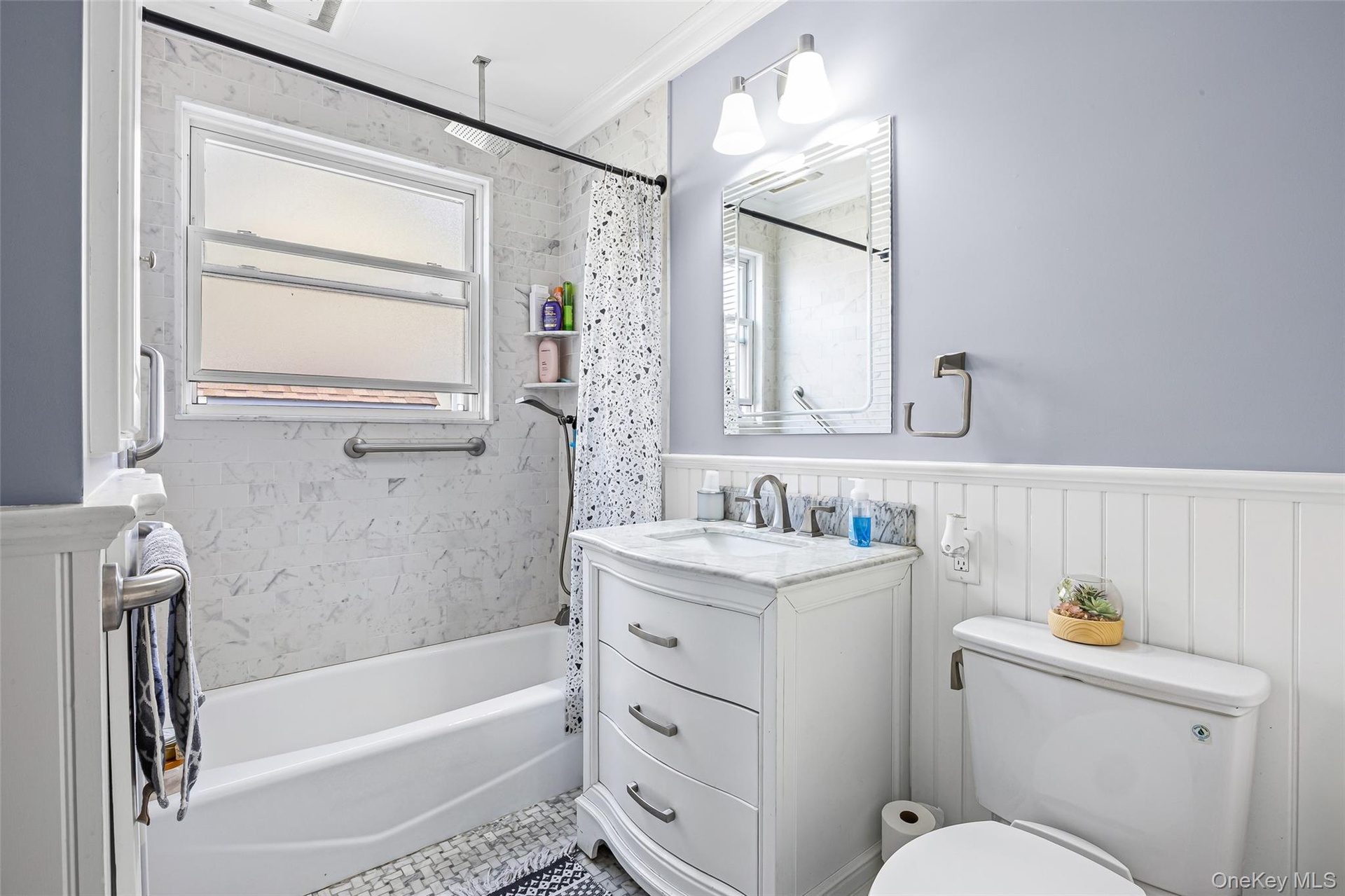 - Bathroom featuring a combined bath / shower with rainfall shower, vanity, ornamental molding, and wainscoting