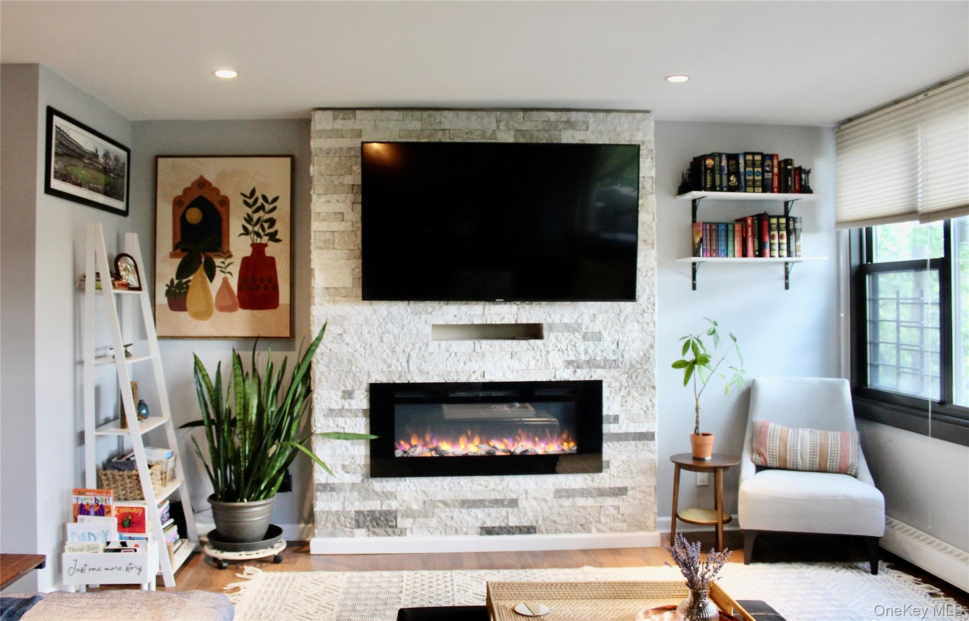 - Living area featuring wood finished floors, a stone fireplace, recessed lighting, a baseboard radiator, and cooling unit