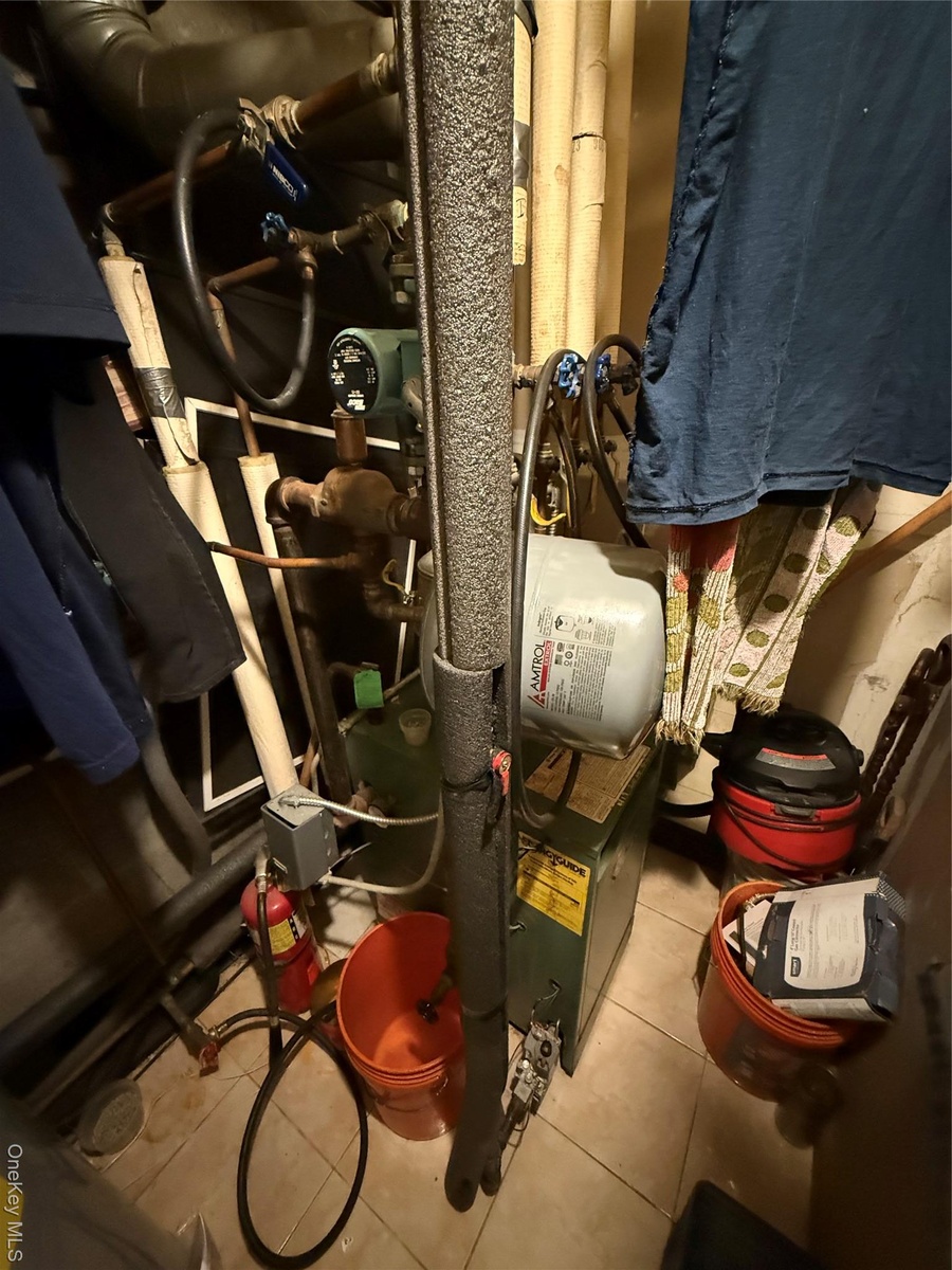 - Half bath with vanity, light tile patterned floors, tile walls, wainscoting, and a baseboard radiator