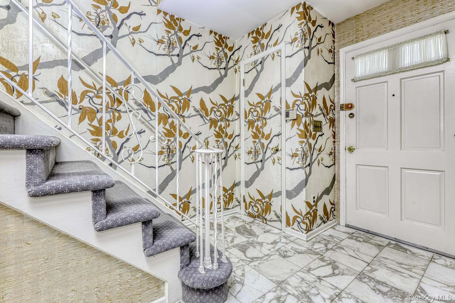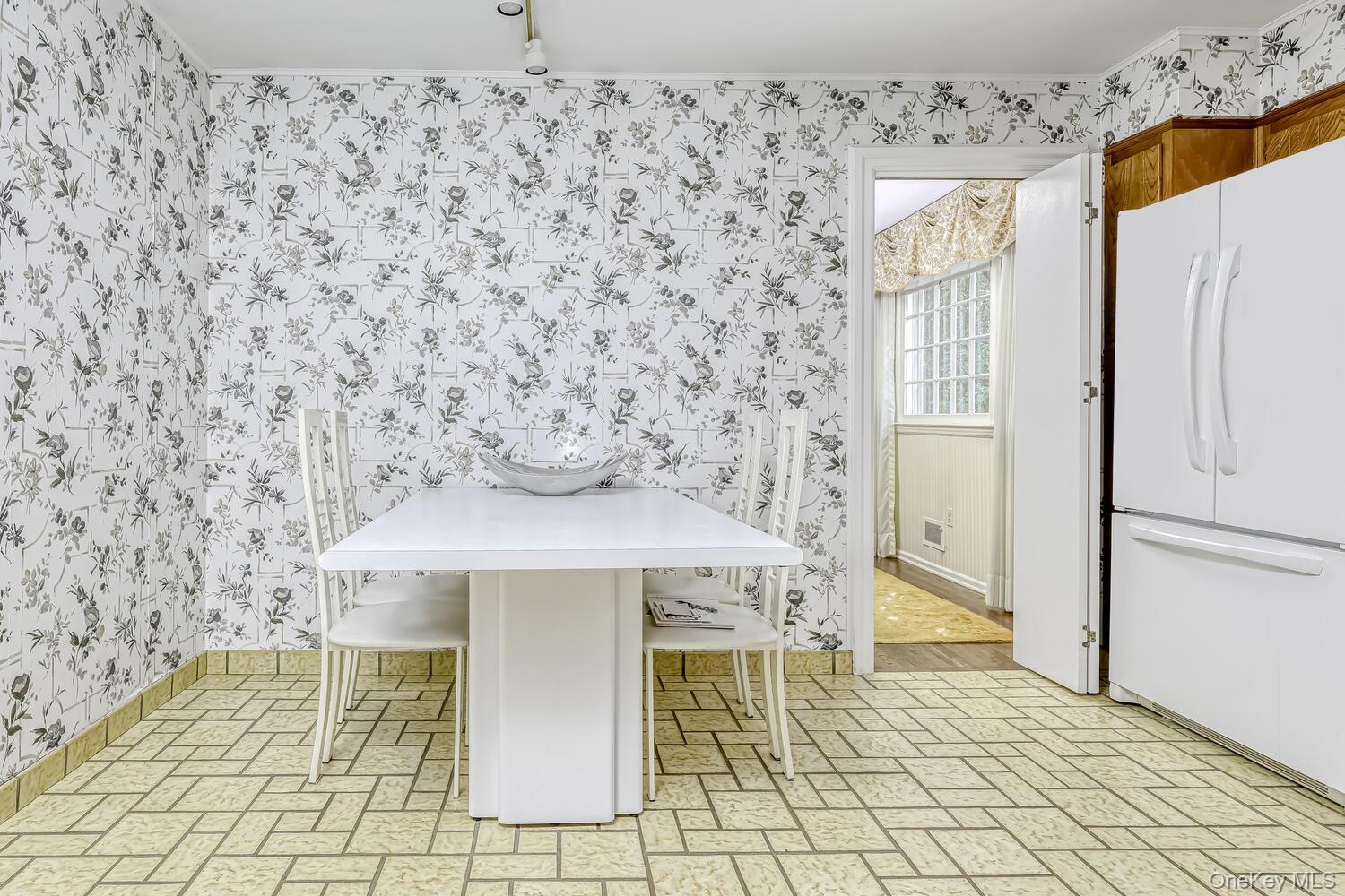 - Unfurnished dining area featuring wallpapered walls and brick patterned floors