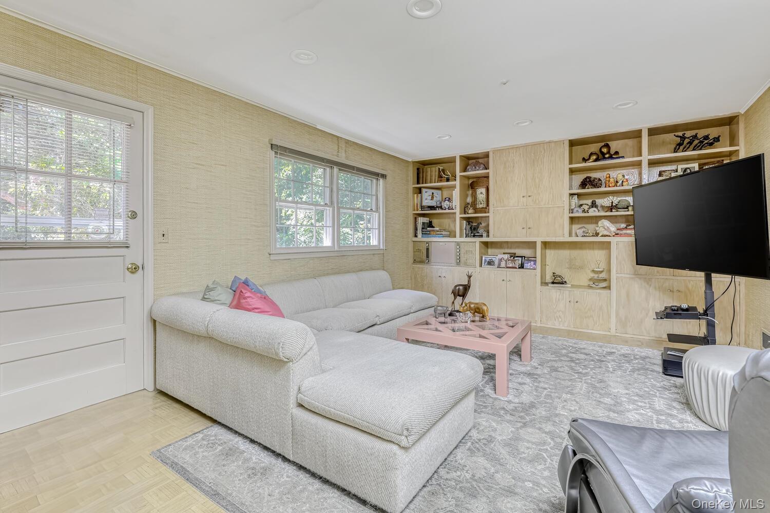 - Living area featuring recessed lighting, built in shelves, and wallpapered walls