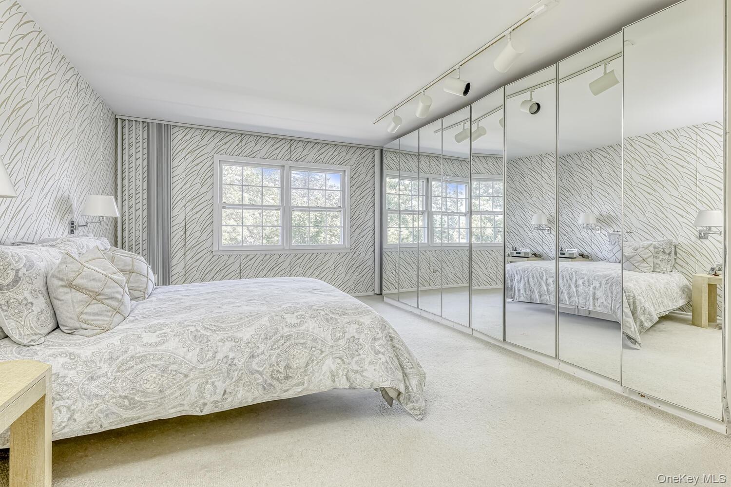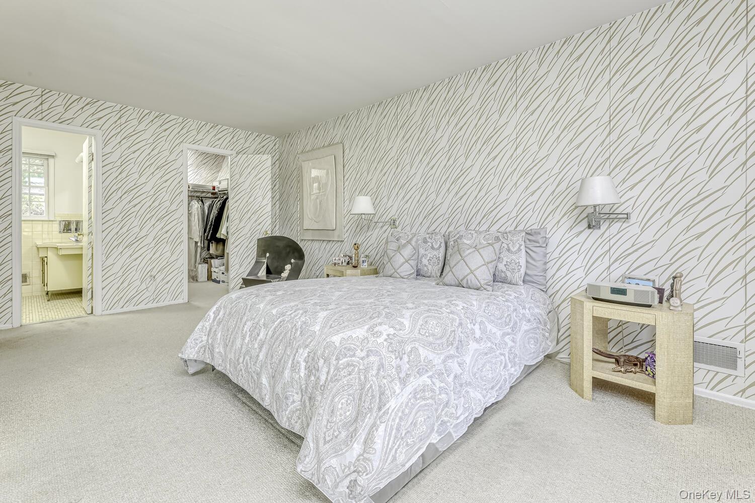 - Carpeted bedroom with a walk in closet, ensuite bathroom, and wallpapered walls