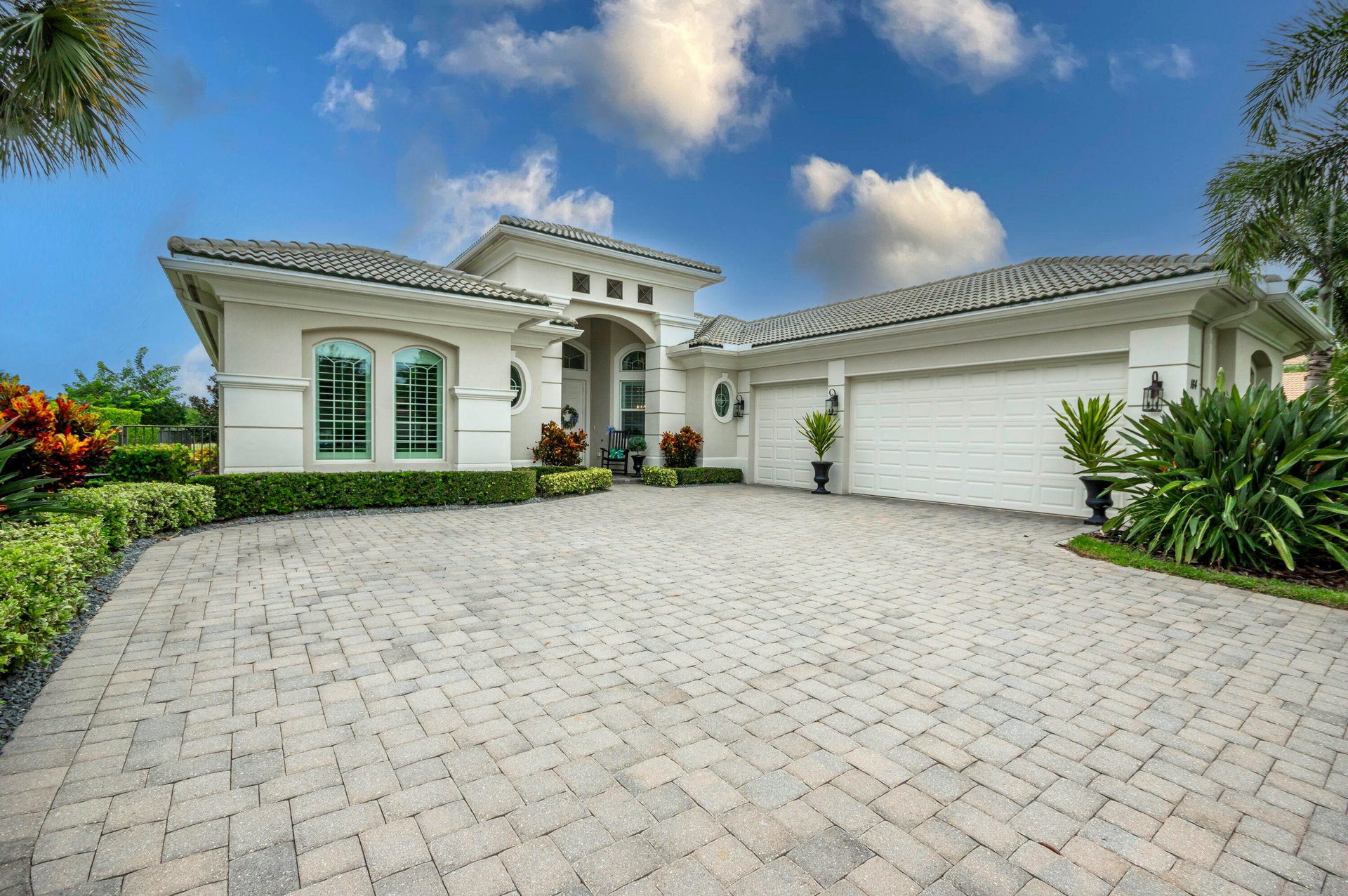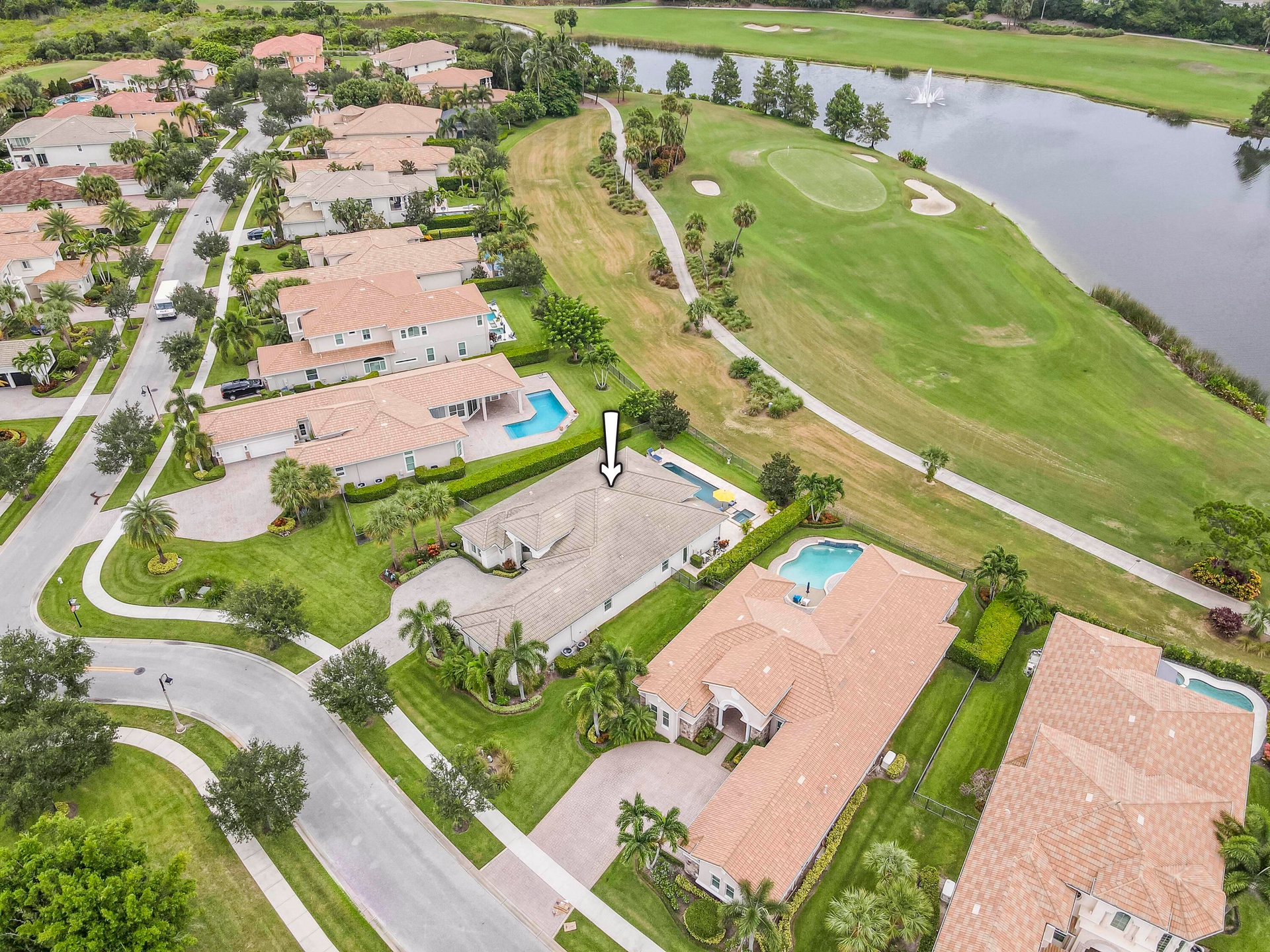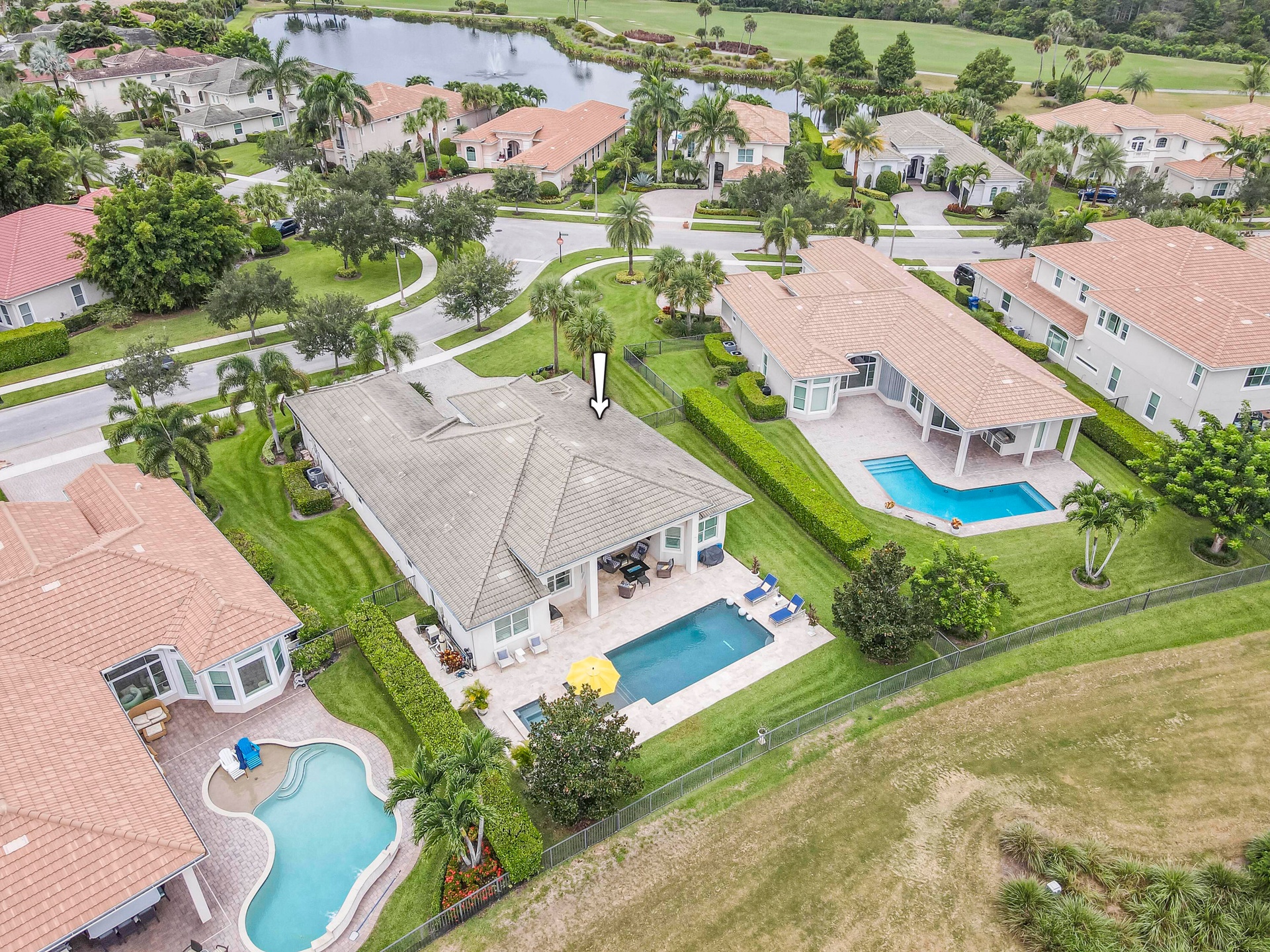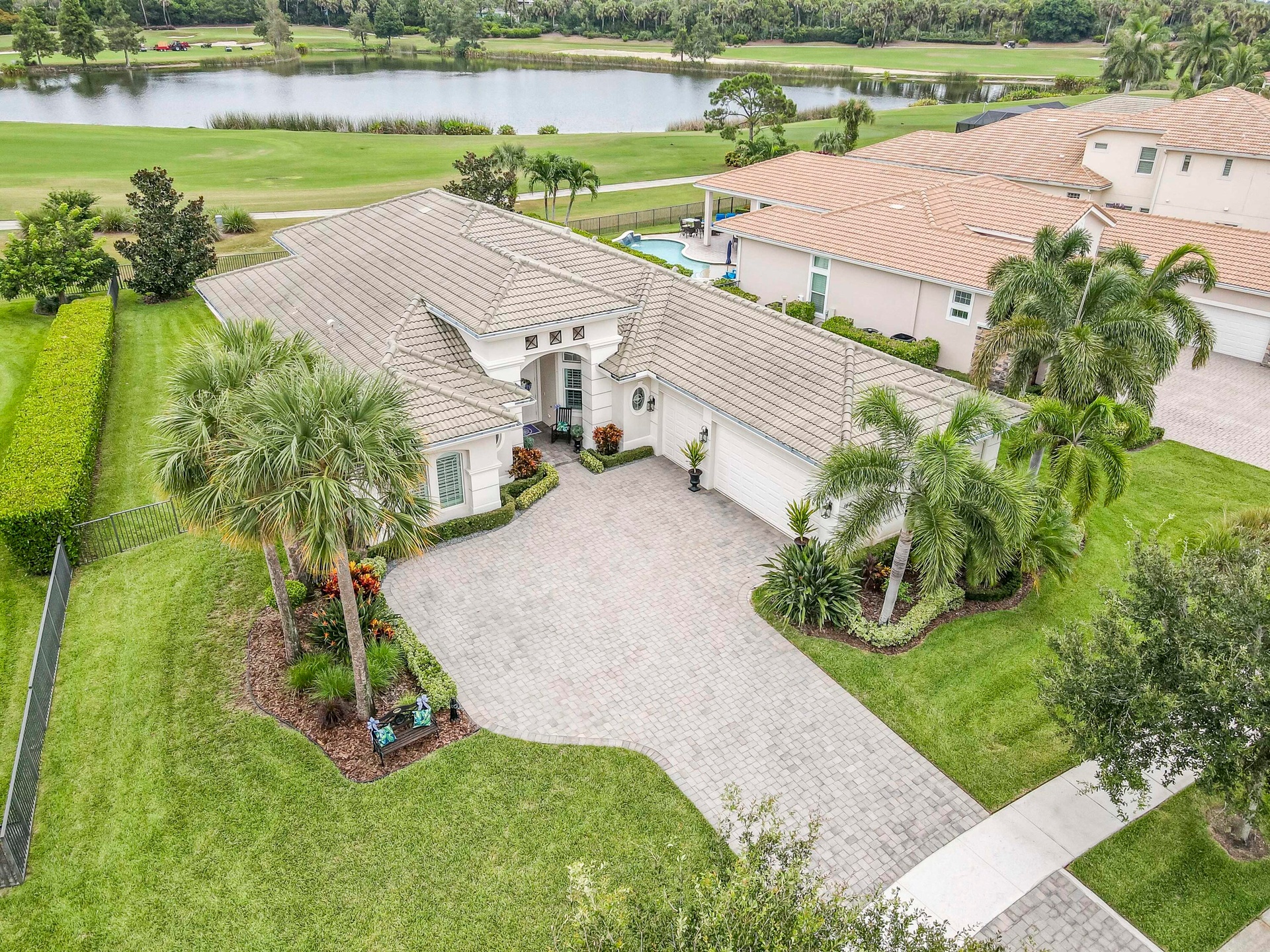 Live luxuriously & comfortably in this single-level Beaumont model with an ultra private homesite in the resort-style gated community of Jupiter Country Club. **FULL GOLF MEMBERSHIP is available immediately to the buyer of this home.** There is currently a long 3-5 year waitlist for this sought-after level of membership. (New owner can downgrade to social/club membership.) This home can be offered turnkey furnished-just bring your toothbrush! The open concept floor plan boasts 4 bedrooms, 3 1/2 baths, a flex room/den and a 3 CAR GARAGE. Privacy abounds from this prime location offering sweeping lake, fountain, golf course & tree-lined views with no homes in the rear. Oversized reverse-pie shaped corner lot with an enormous side yard. This home is beautifully appointed and provides all the