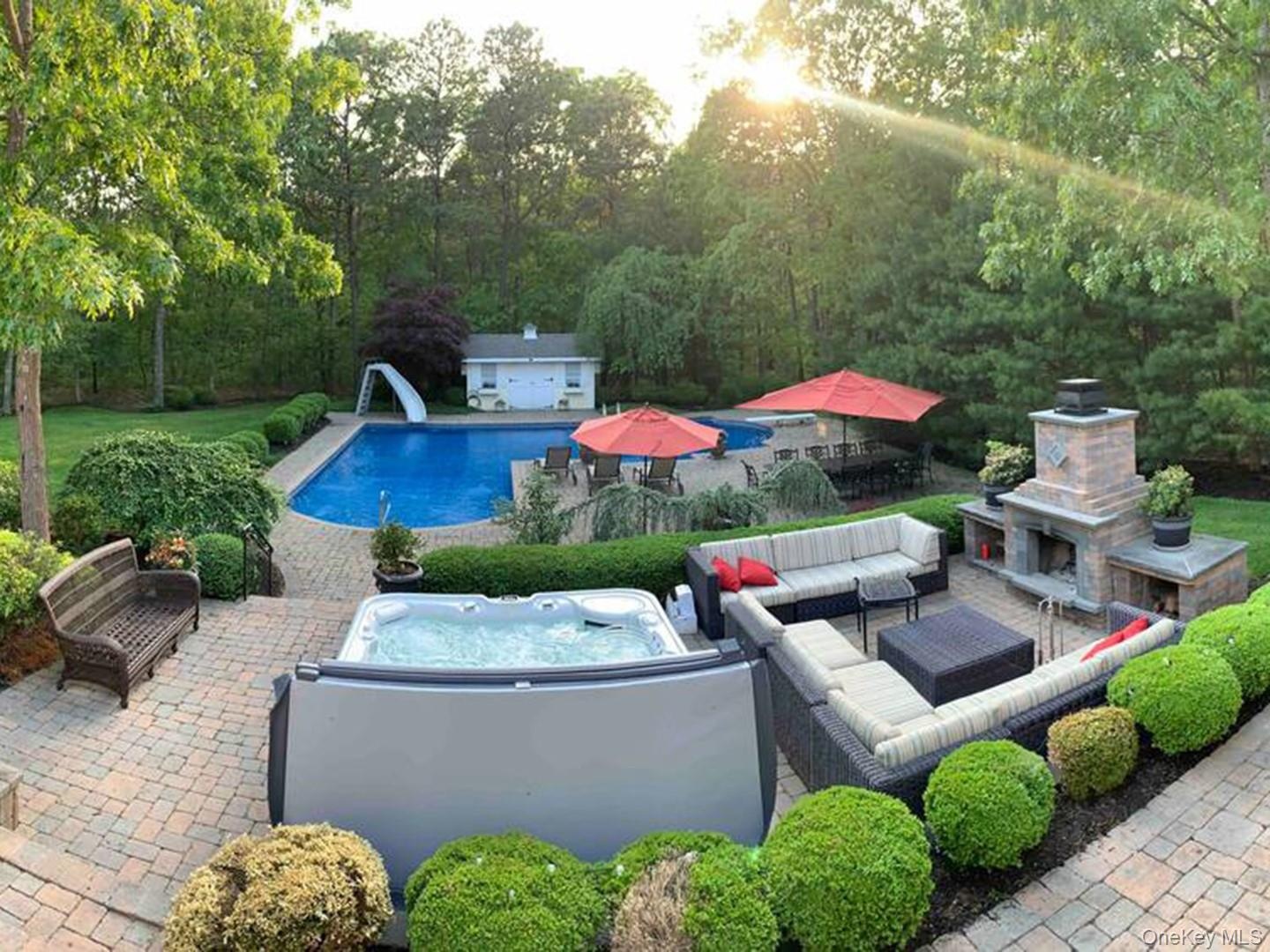- Outdoor salt water pool featuring a water slide, a patio, an outdoor living space with a fireplace, and a salt water hot tub