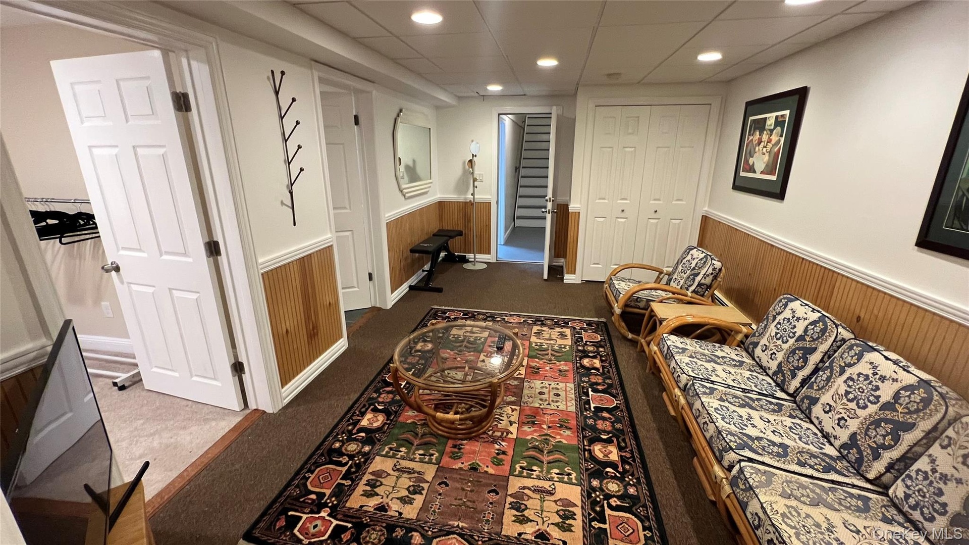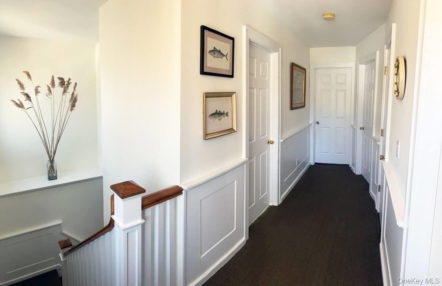 - Hallway featuring dark wood finished floors. Half bathroom.