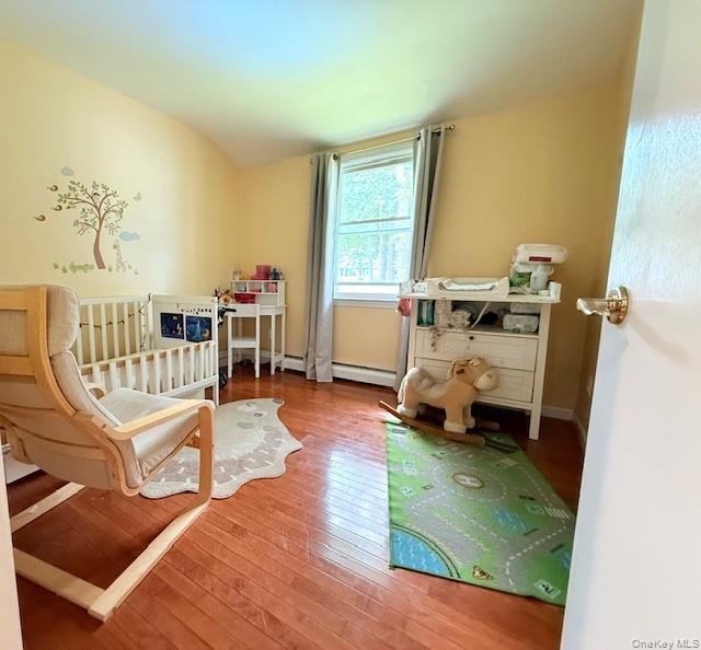 - Bedroom featuring wood finished floors and a baseboard radiator