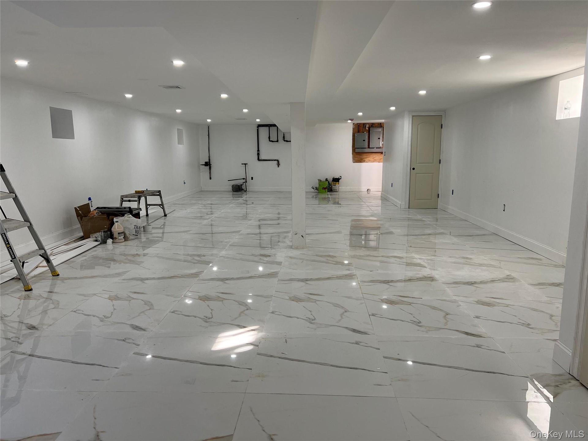 - Finished below grade area featuring recessed lighting and light marble finish floors