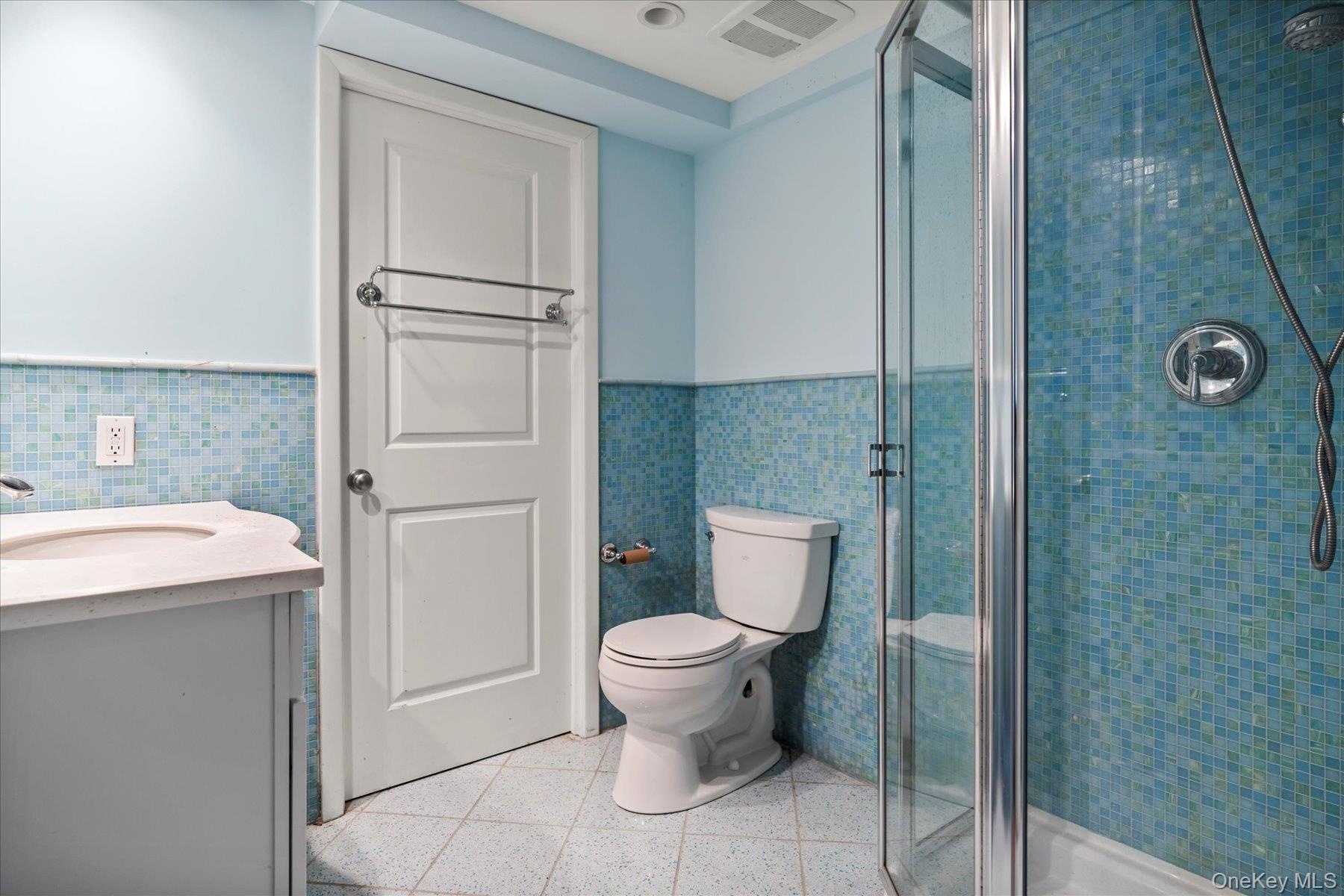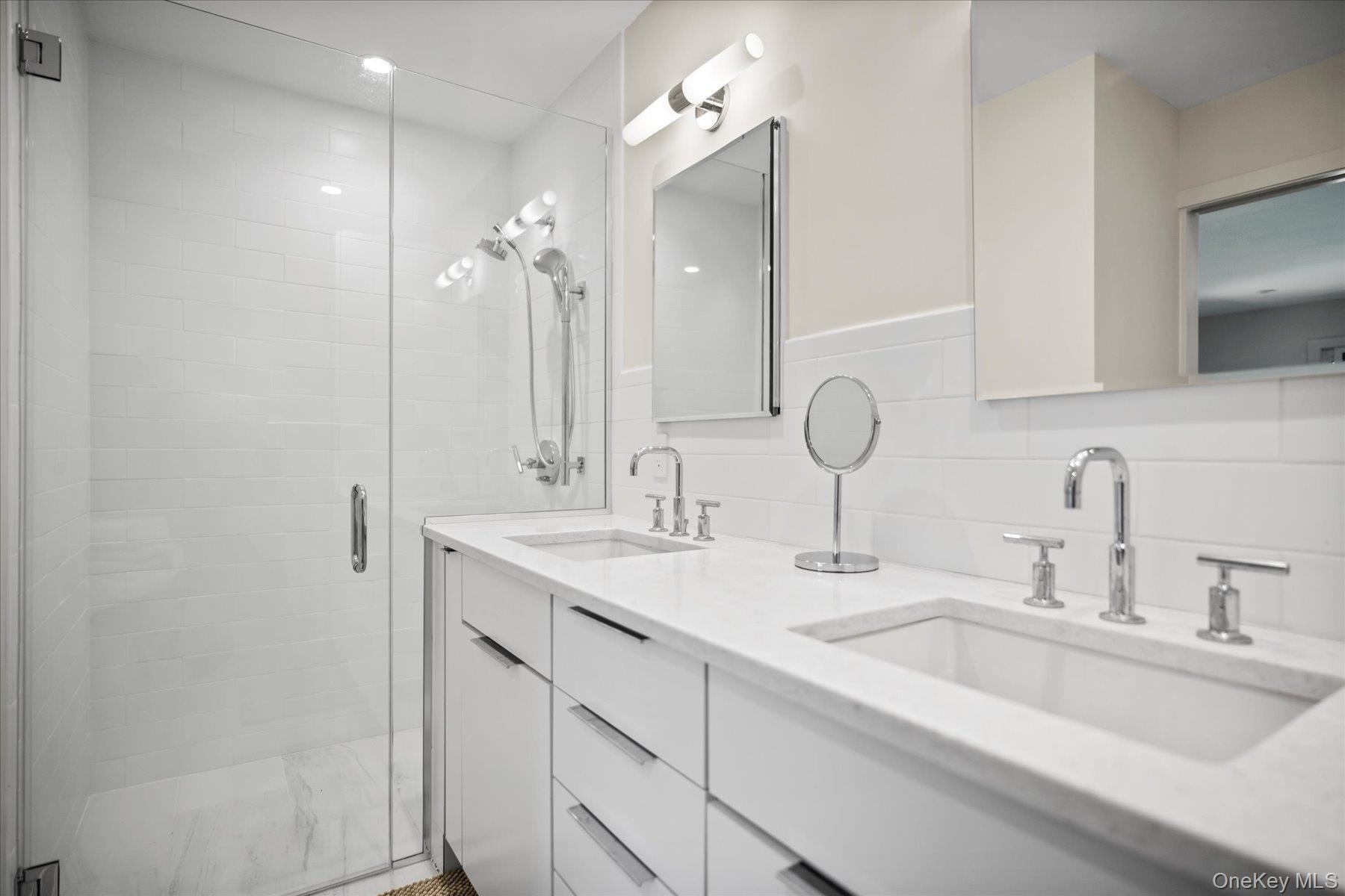 - Bathroom with a shower stall, backsplash, double vanity, and tile walls
