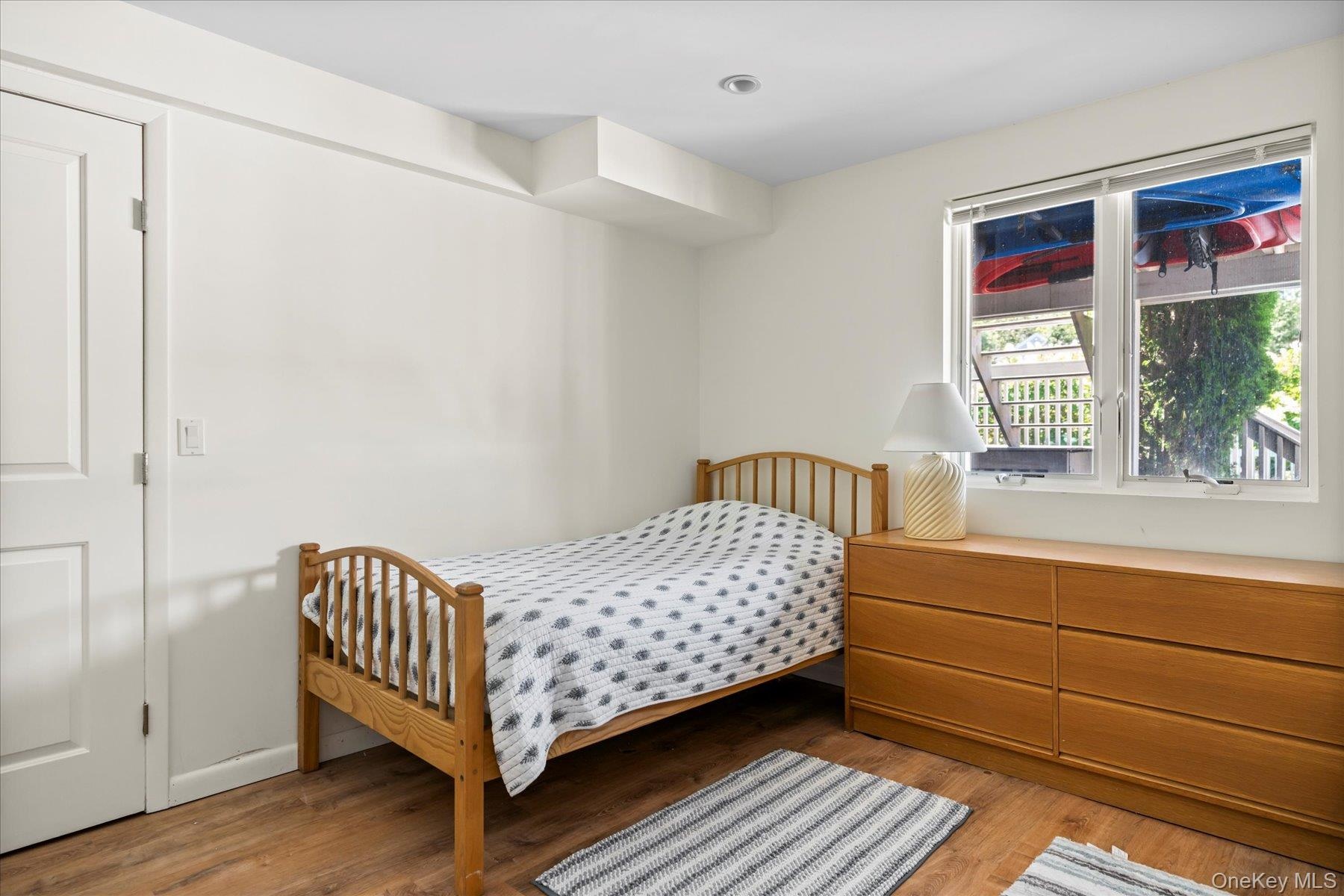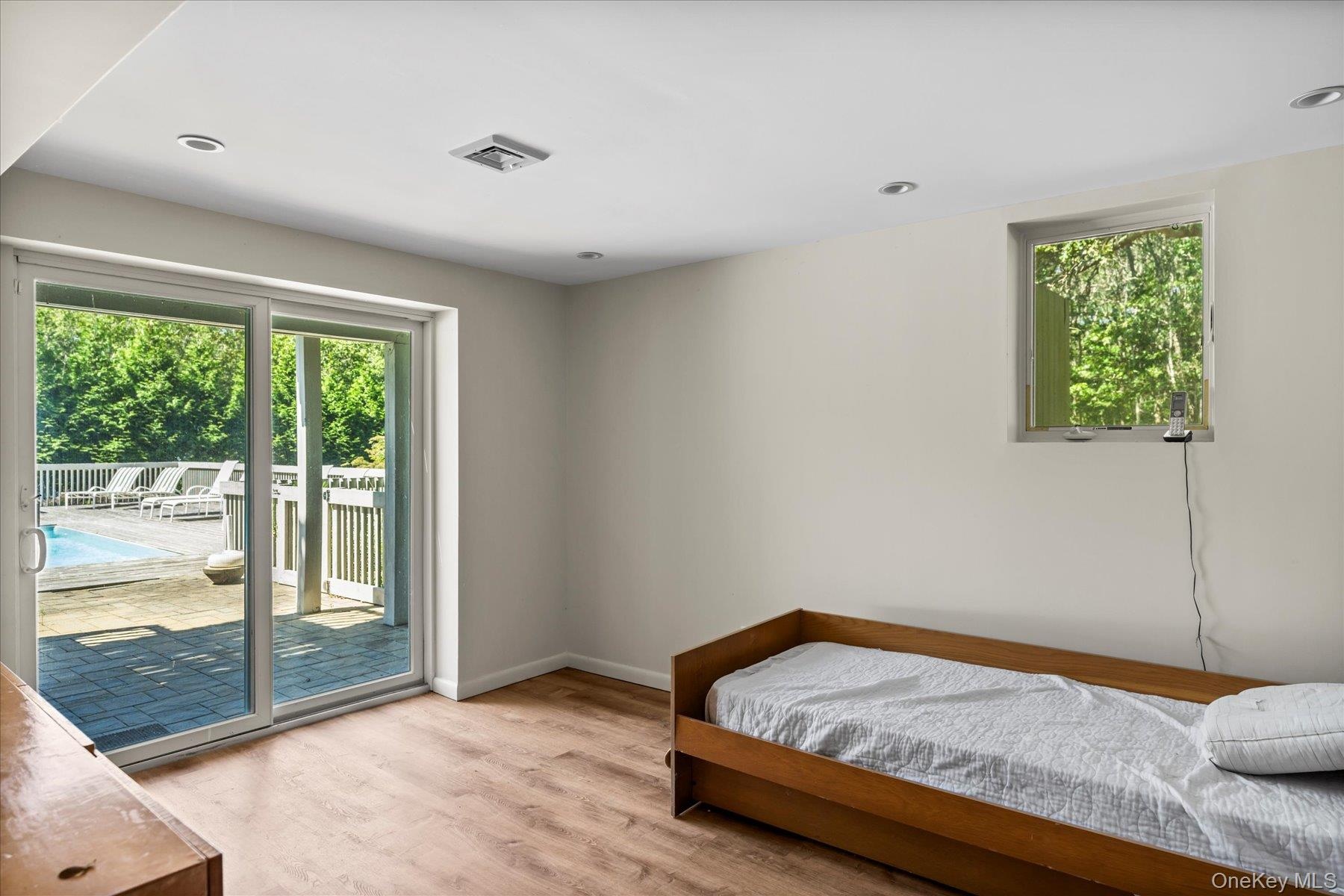 - Bedroom with multiple windows, access to exterior, light wood-style floors, and recessed lighting