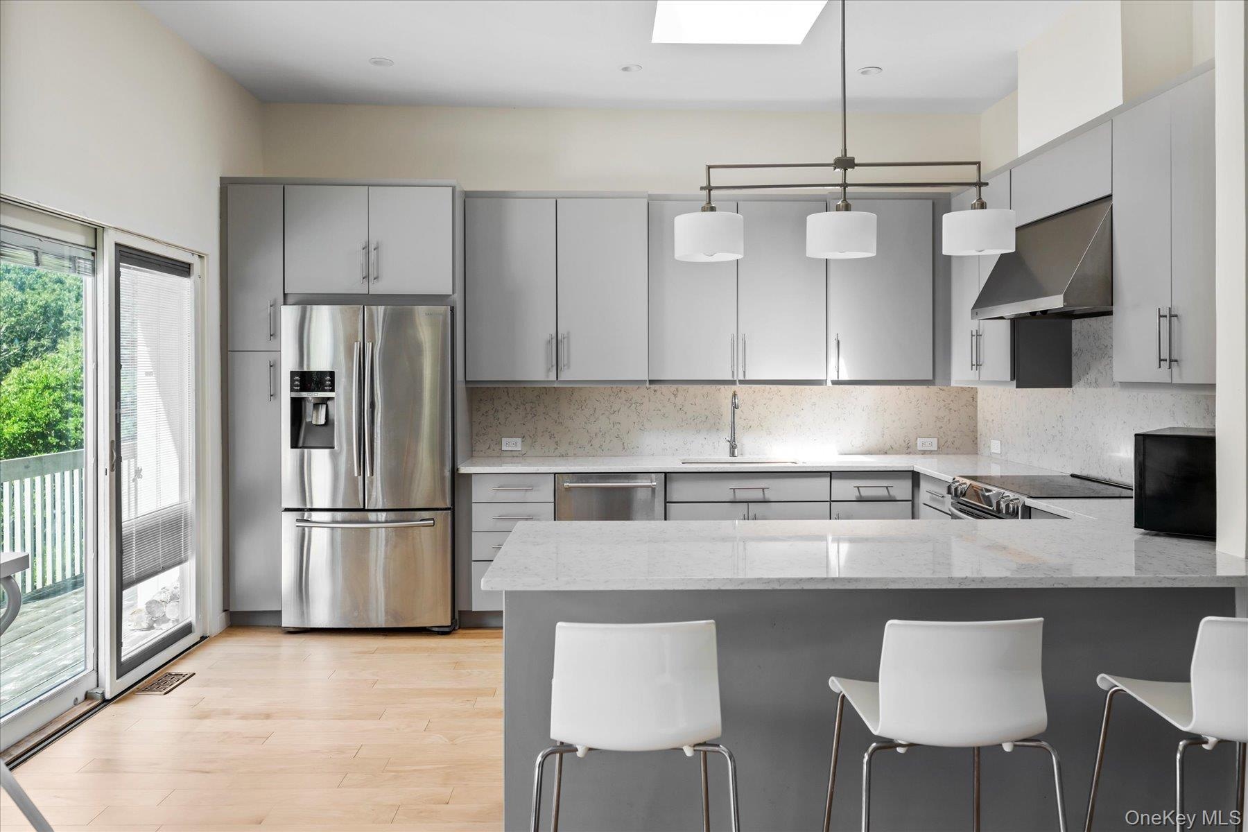 - Kitchen with decorative light fixtures, stainless steel appliances, a breakfast bar, and light stone countertops