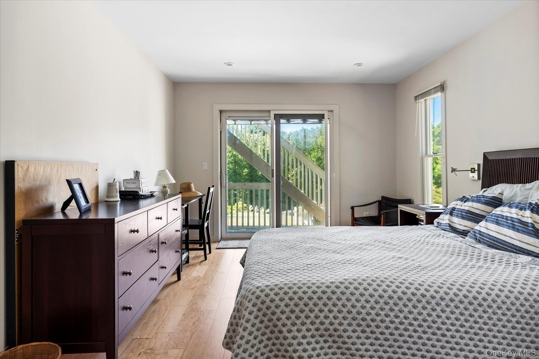 - Bedroom featuring multiple windows, access to outside, light wood finished floors, and recessed lighting