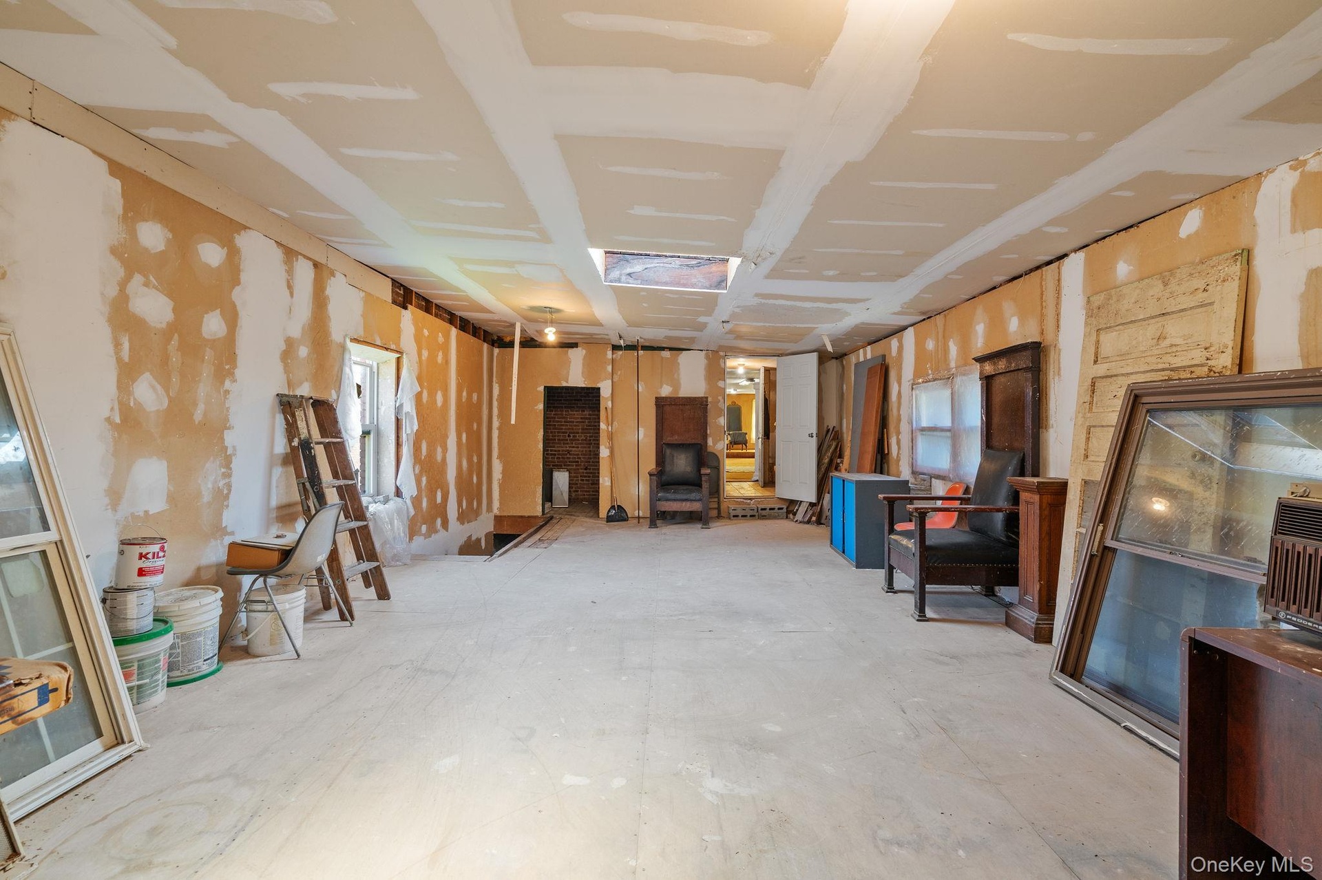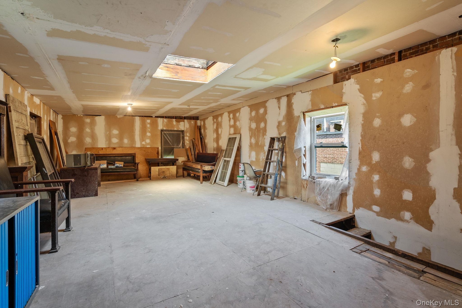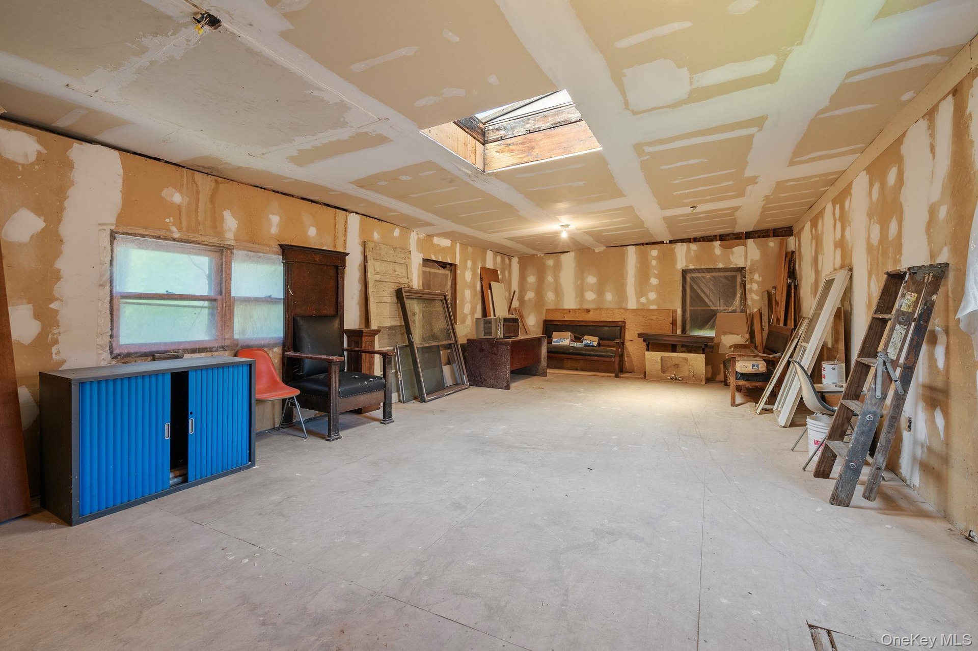 - Miscellaneous room featuring a skylight and unfinished concrete flooring