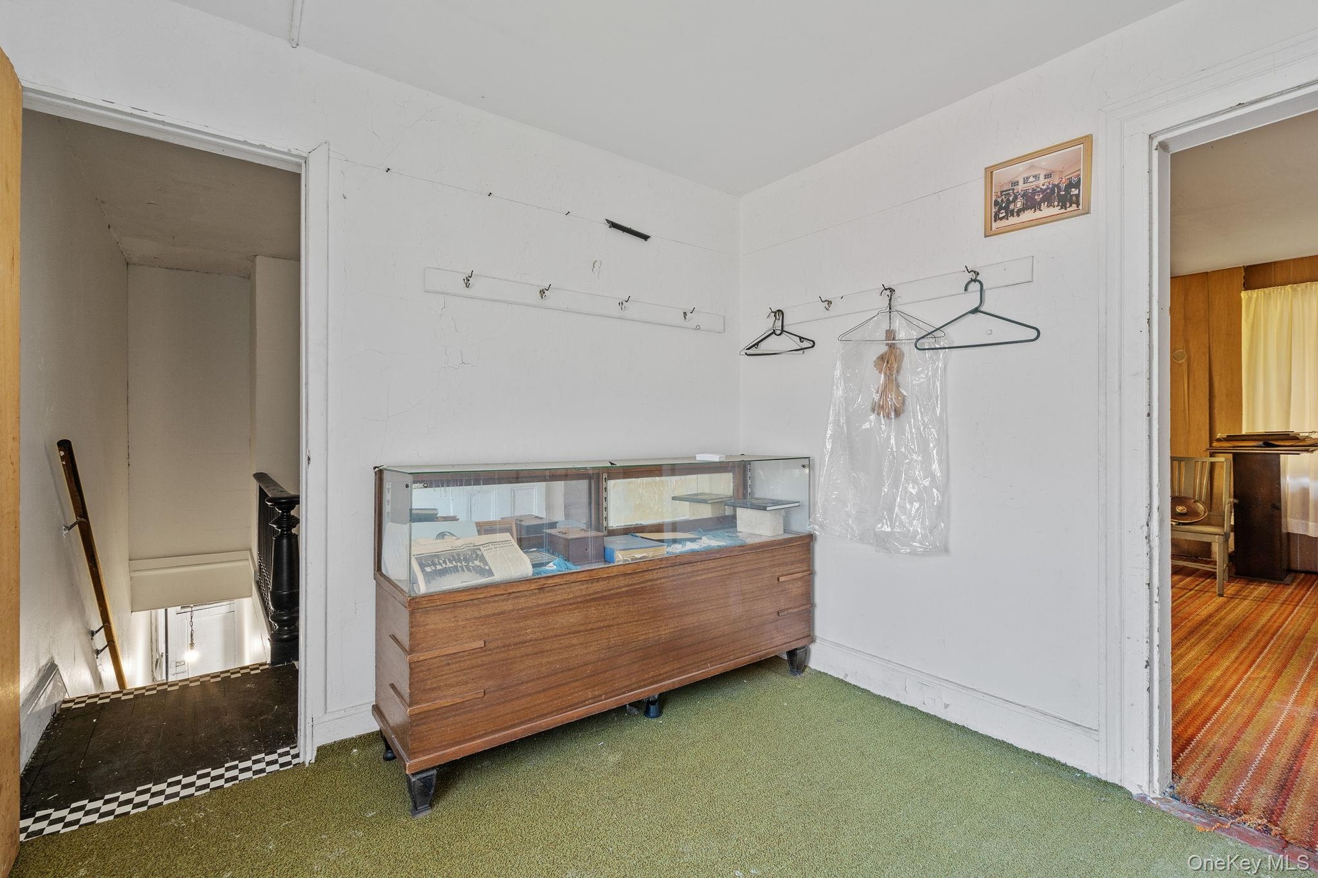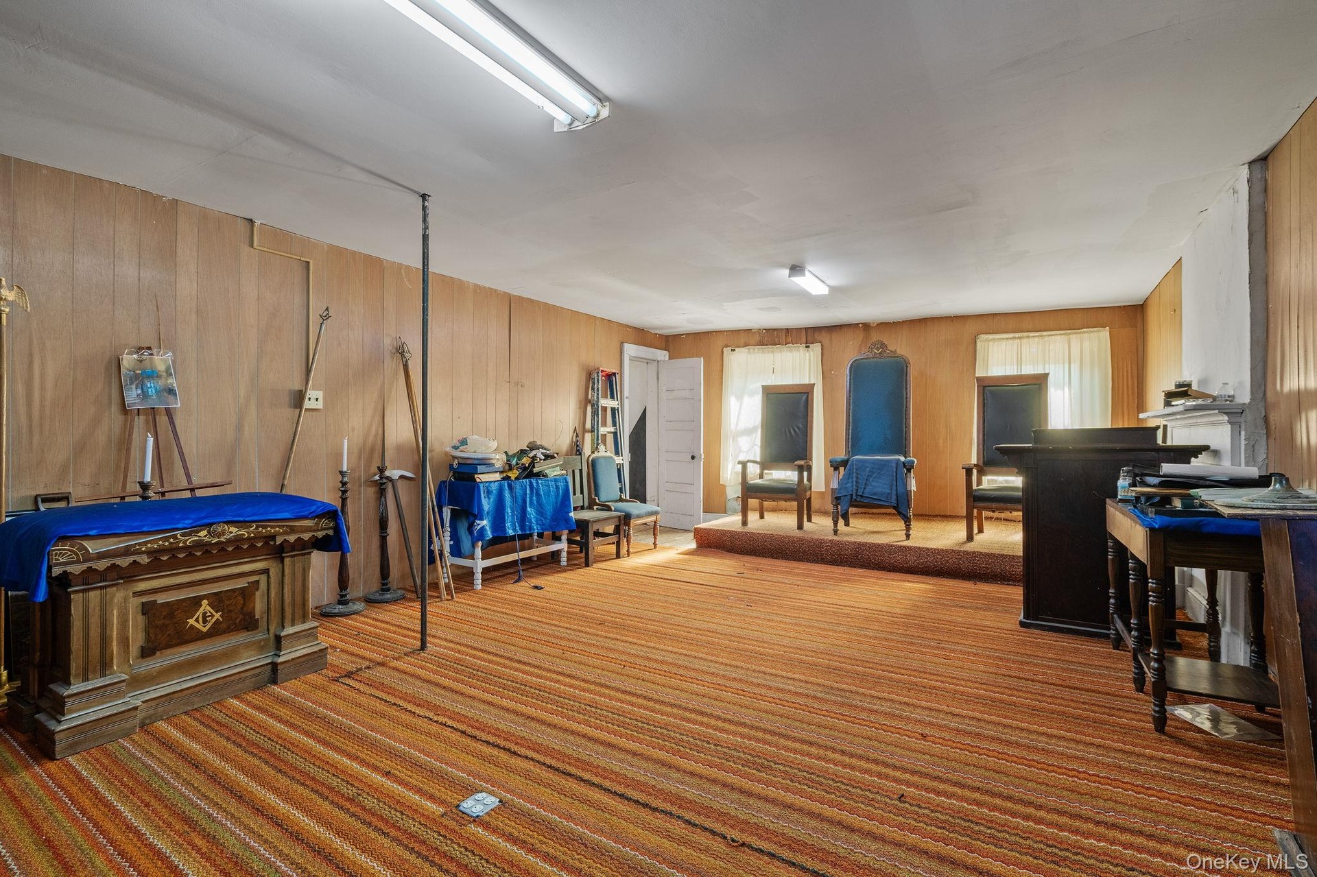 - Misc room with wooden walls and carpet flooring