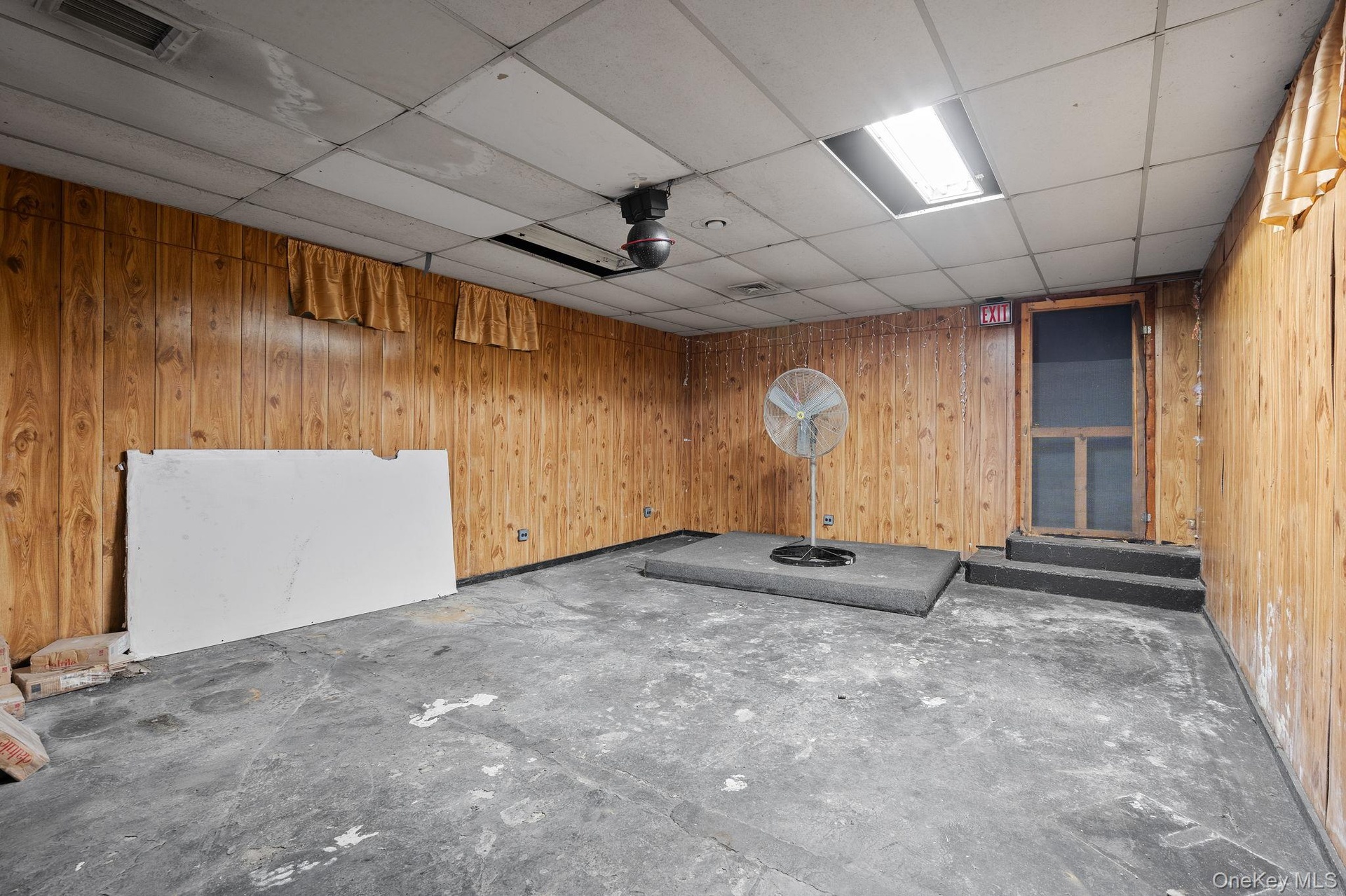 - Miscellaneous room with a drop ceiling, concrete floors, and a heating unit