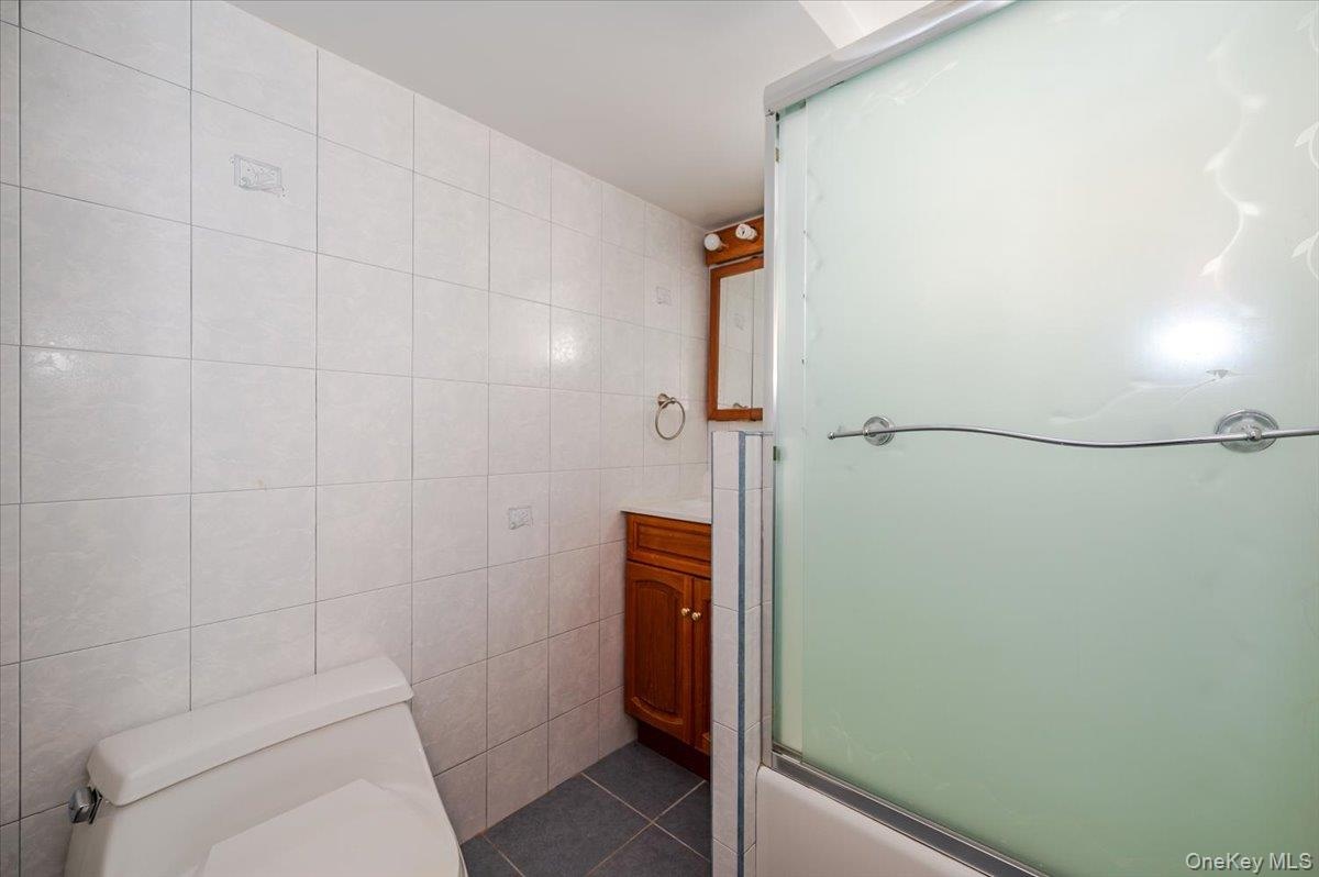 - Bathroom featuring vanity, tile walls, bath / shower combo with glass door, and dark tile patterned flooring
