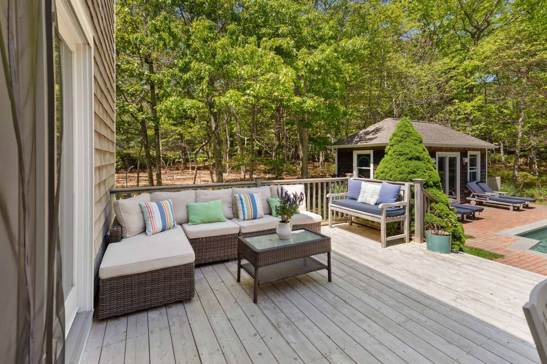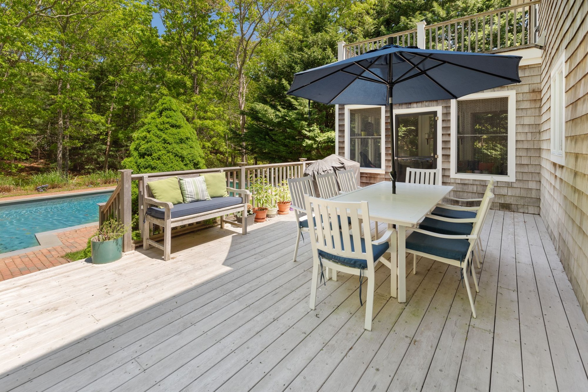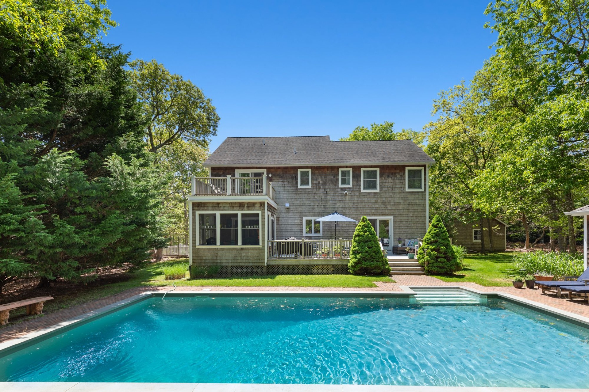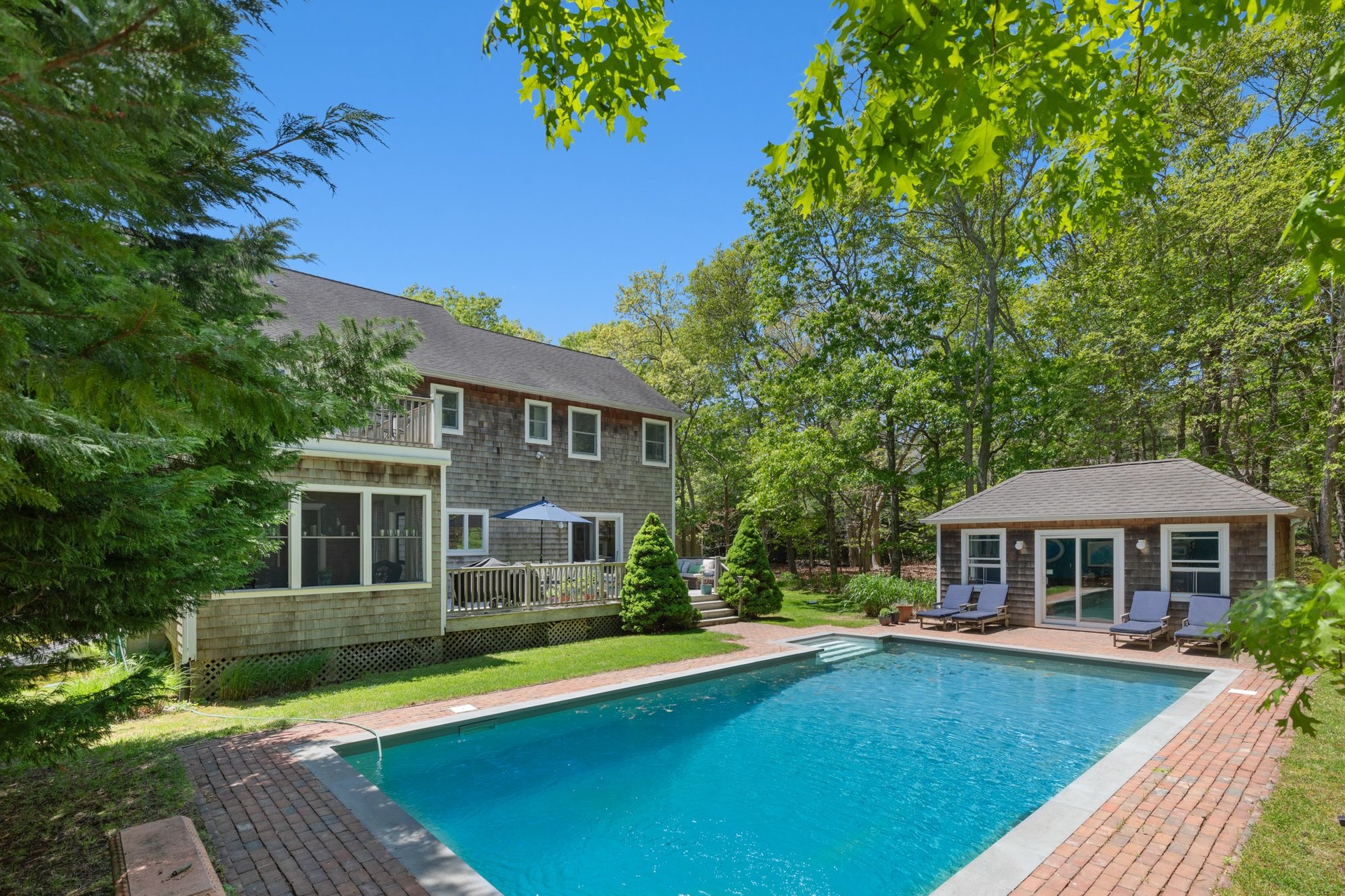 Spacious, light-filled home featuring 4 bedrooms, 4.5 baths, fireplace and open kitchen/dining area. There's a screened-in porch, a large deck beside the pool and a pool house. The house is in a secluded area, surrounded by nature, just minutes to the beach, town, shopping, restaurants and you can walk to the bay.