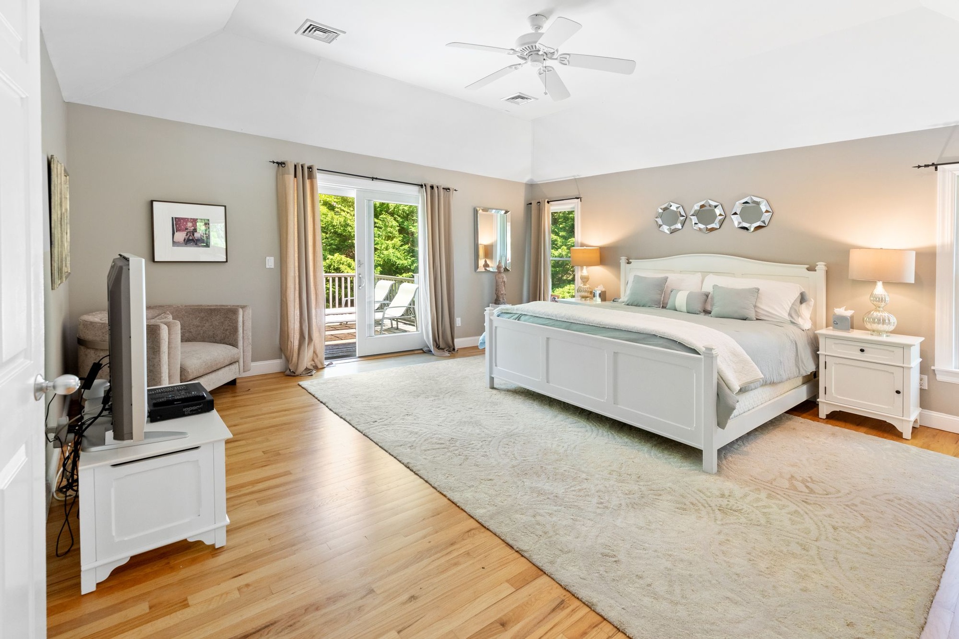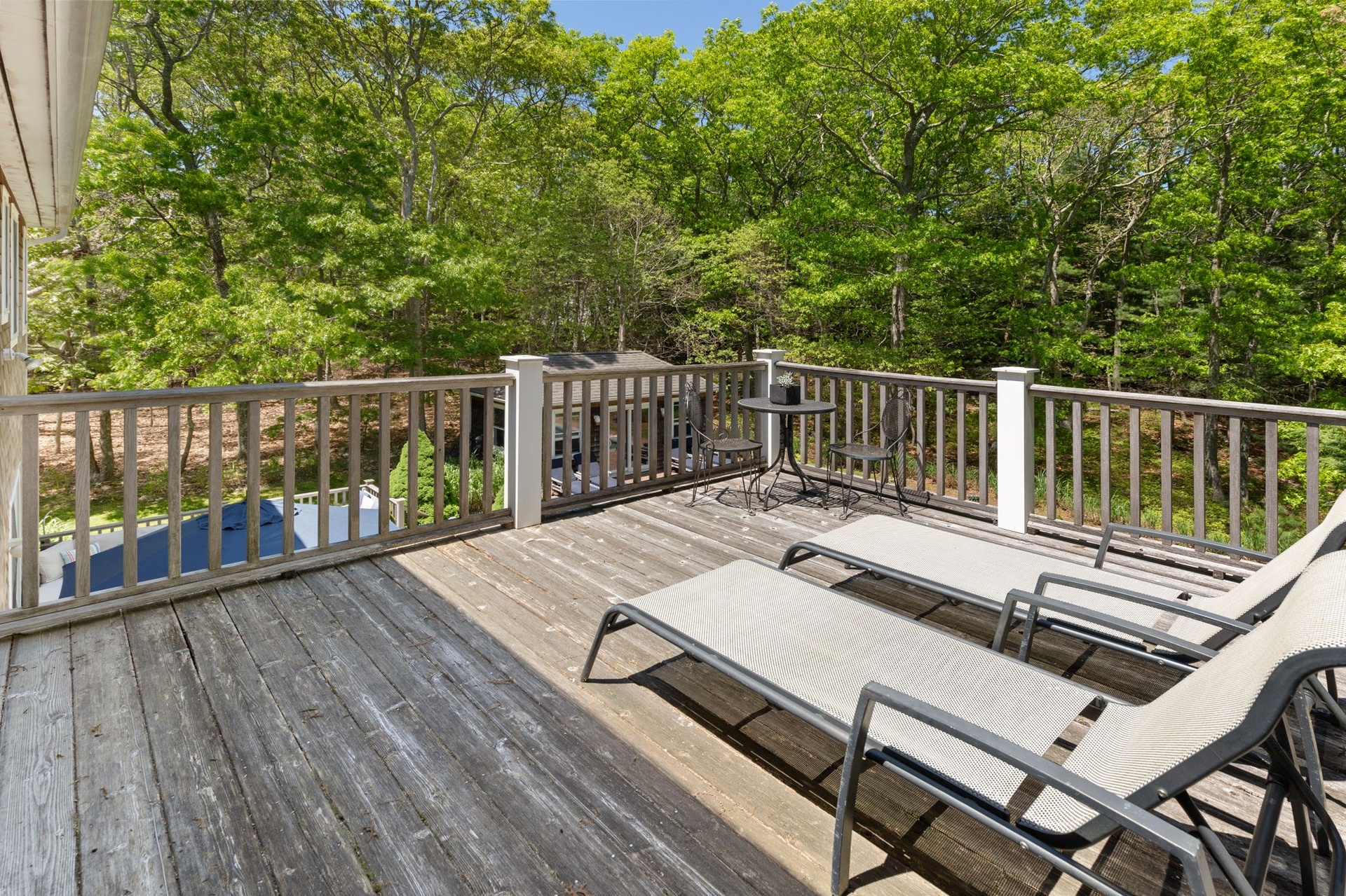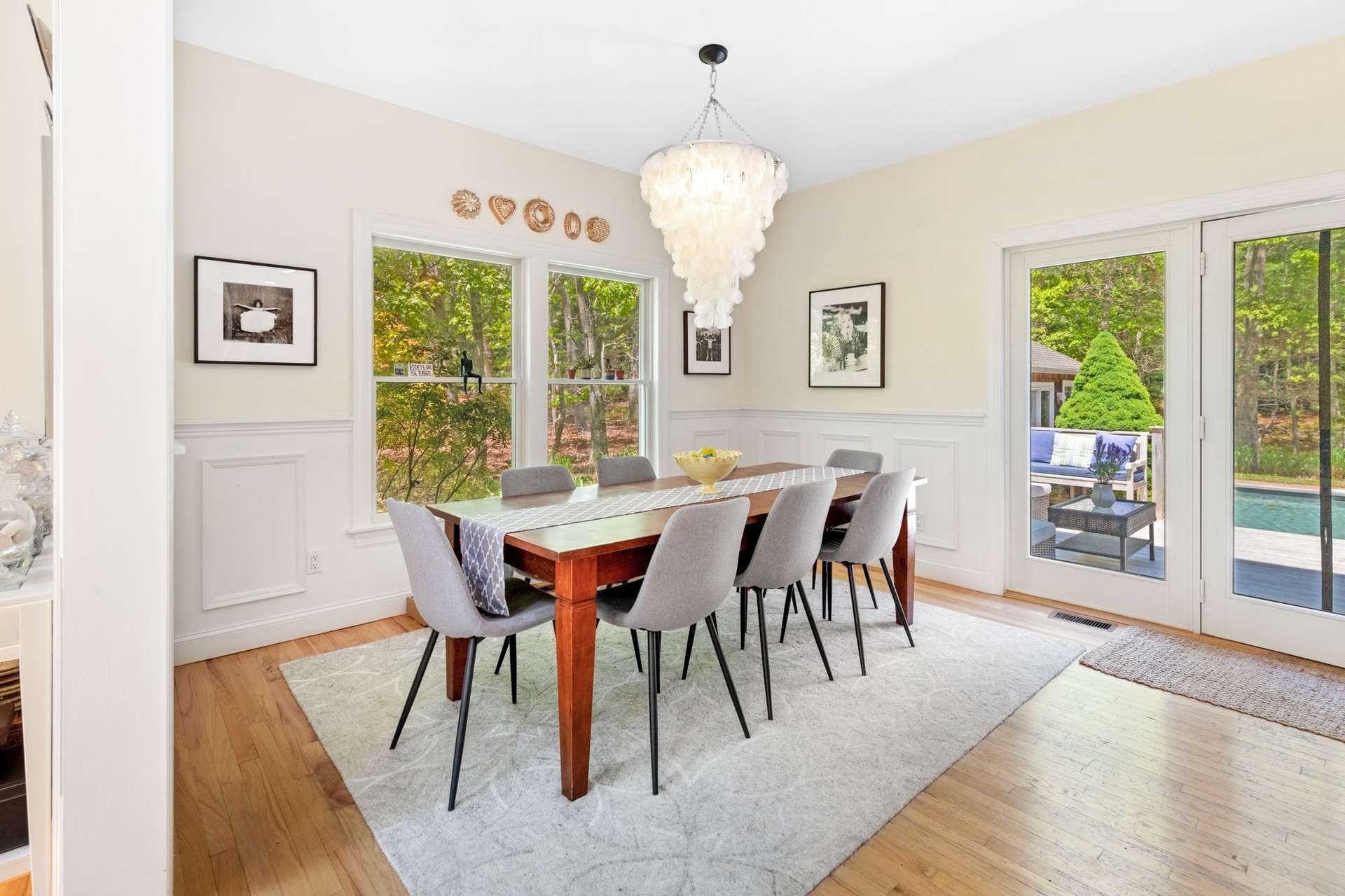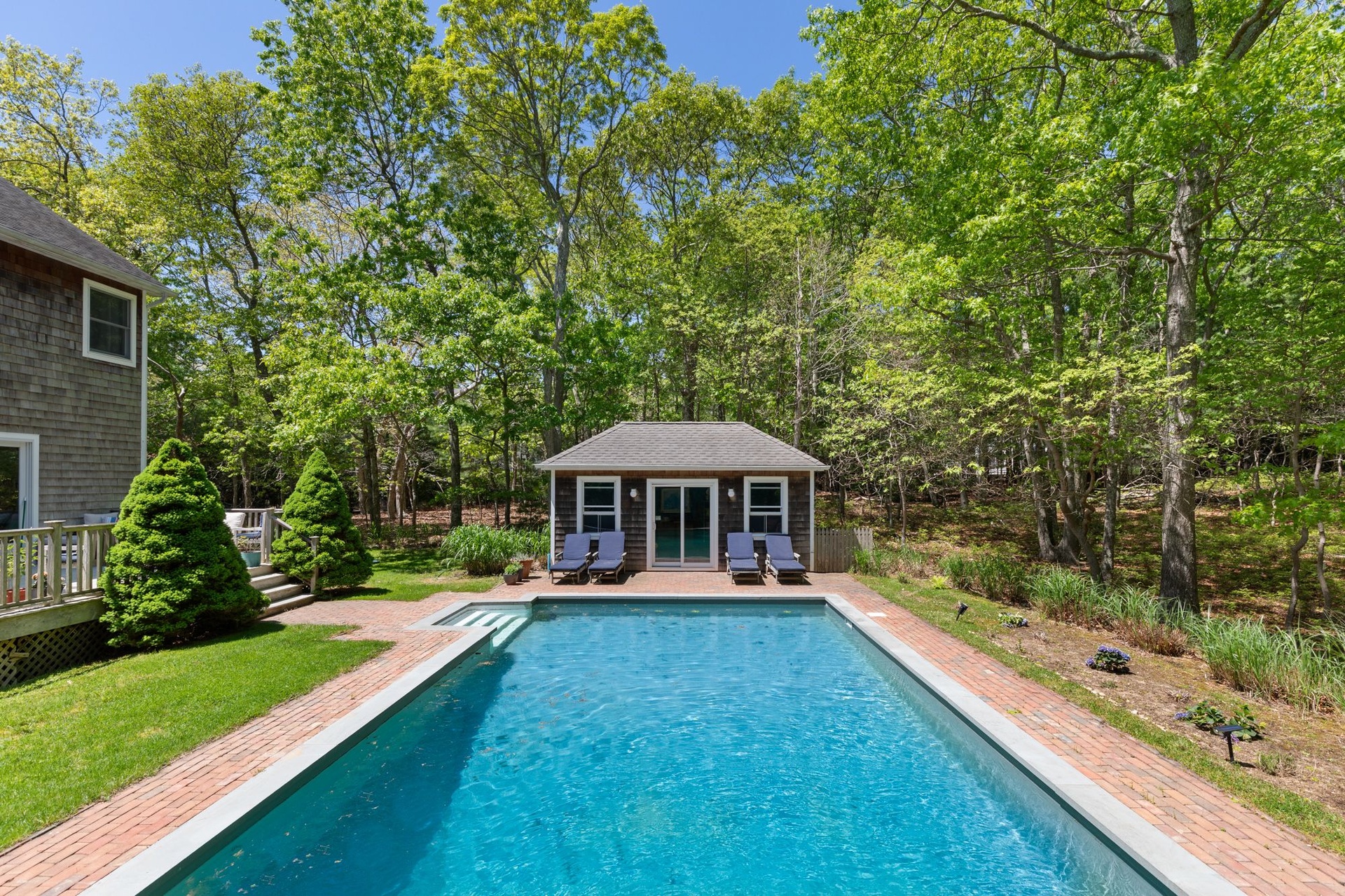 Spacious, light-filled home featuring 4 bedrooms, 4.5 baths, fireplace and open kitchen/dining area. There's a screened-in porch, a large deck beside the pool and a pool house. The house is in a secluded area, surrounded by nature, just minutes to the beach, town, shopping, restaurants and you can walk to the bay.