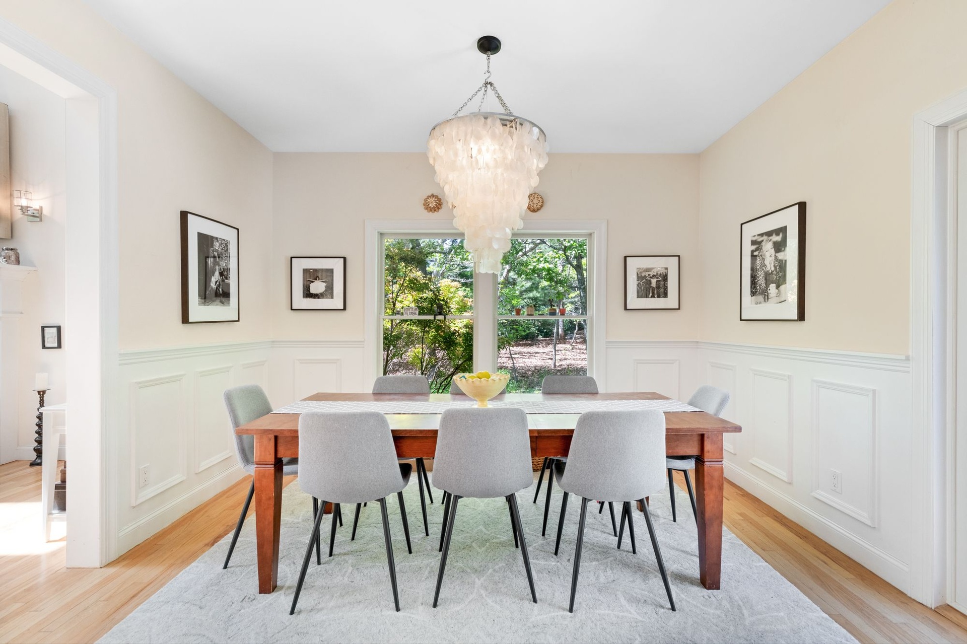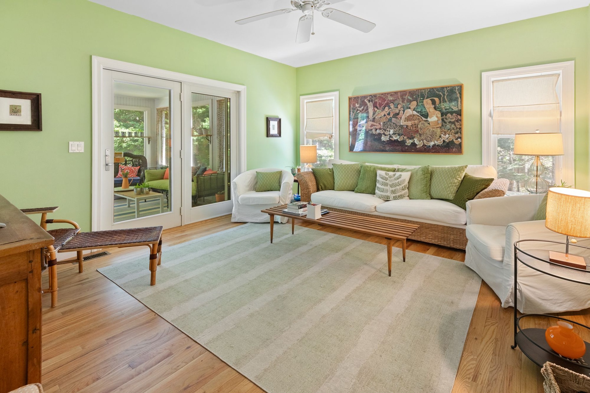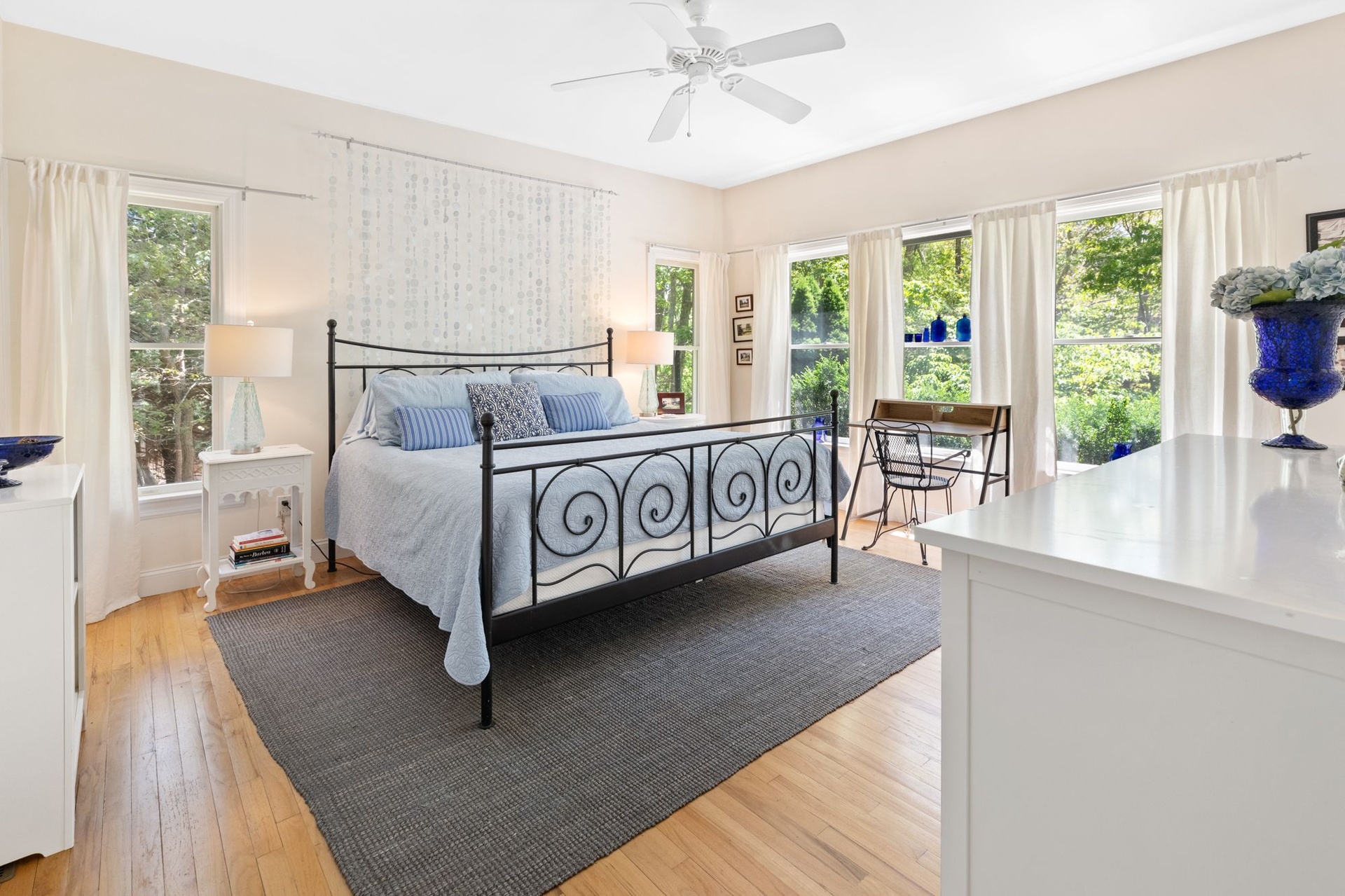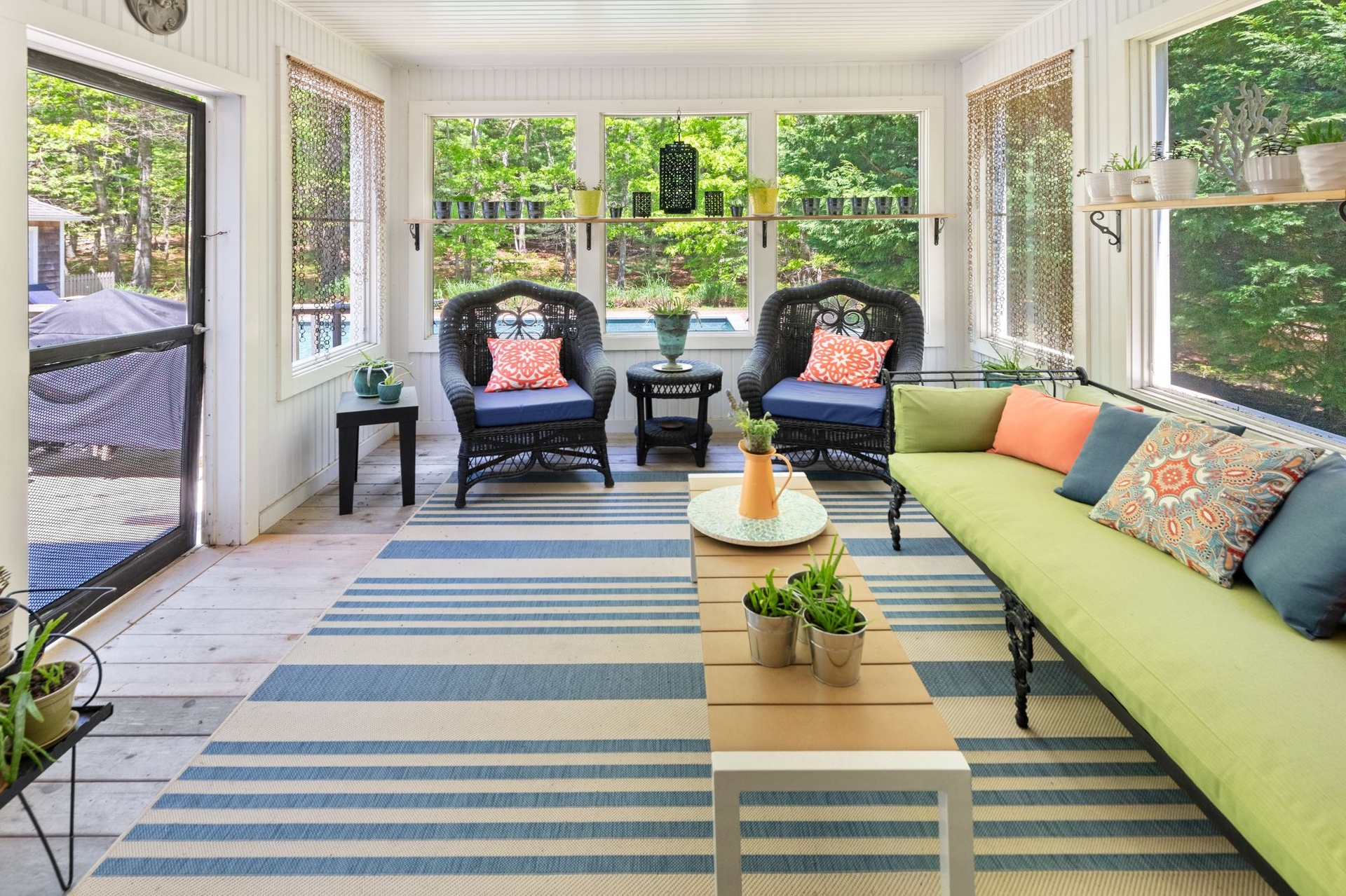 Spacious, light-filled home featuring 4 bedrooms, 4.5 baths, fireplace and open kitchen/dining area. There's a screened-in porch, a large deck beside the pool and a pool house. The house is in a secluded area, surrounded by nature, just minutes to the beach, town, shopping, restaurants and you can walk to the bay.